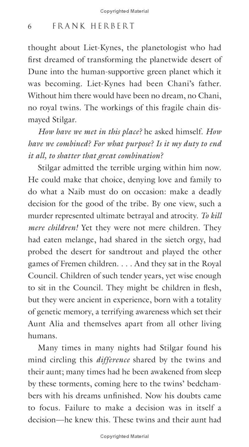 The Children of Dune are twin siblings Leto and Ghanima Atreides, whose father, the Emperor Paul Muad’Dib, disappeared in the desert wastelands of Arrakis nine years ago. Like their father, the twins possess supernormal abilities—making them valuable to their manipulative aunt Alia, who rules the Empire in the name of House Atreides.
