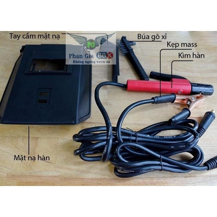 • Phụ kiện máy hàn gồm: kìm hàn 300A, kẹp mass 300A, búa gõ xỉ, mặt nạ hàn.
