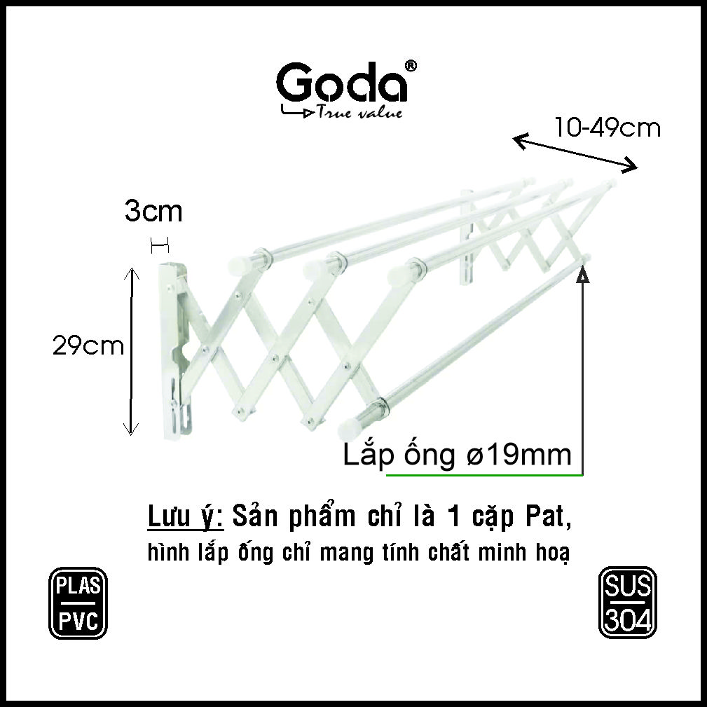 Bộ Pat ống 19 (inox 304-V4): khi bung ra rộng 49cm, đóng lại 10cm, chiều cao 27cm