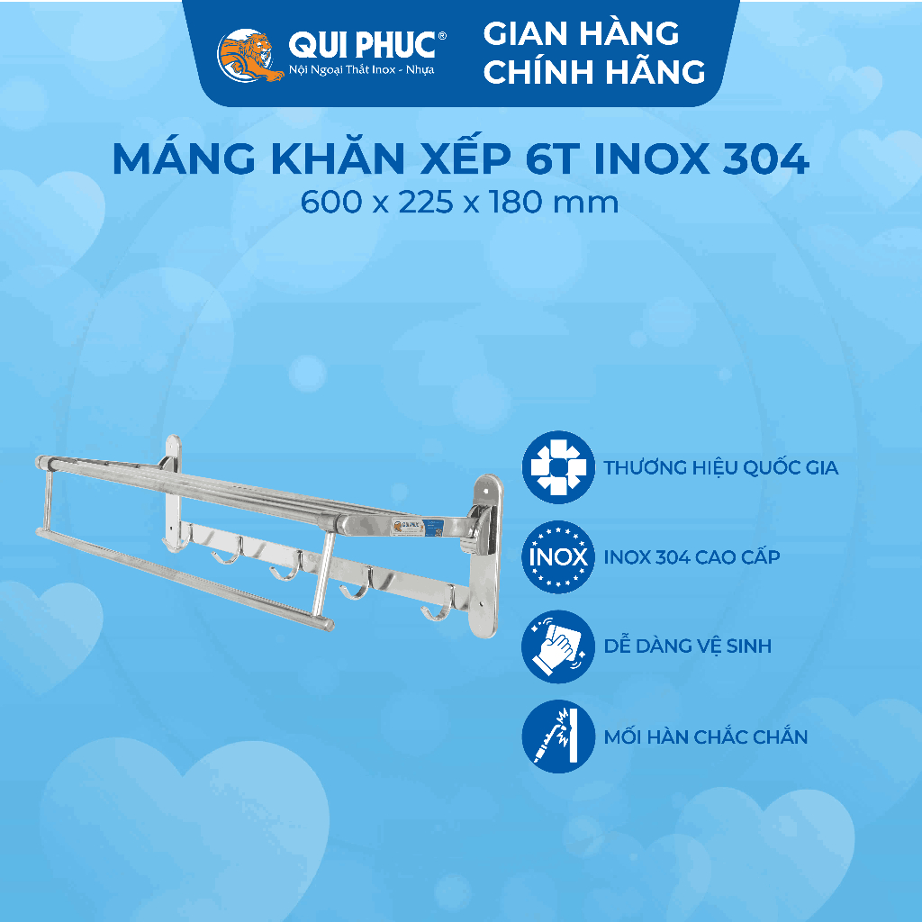 ✨[Chính hãng Qui Phúc] Máng khăn xếp inox 304, có móc treo tiện lợi 6 tấc