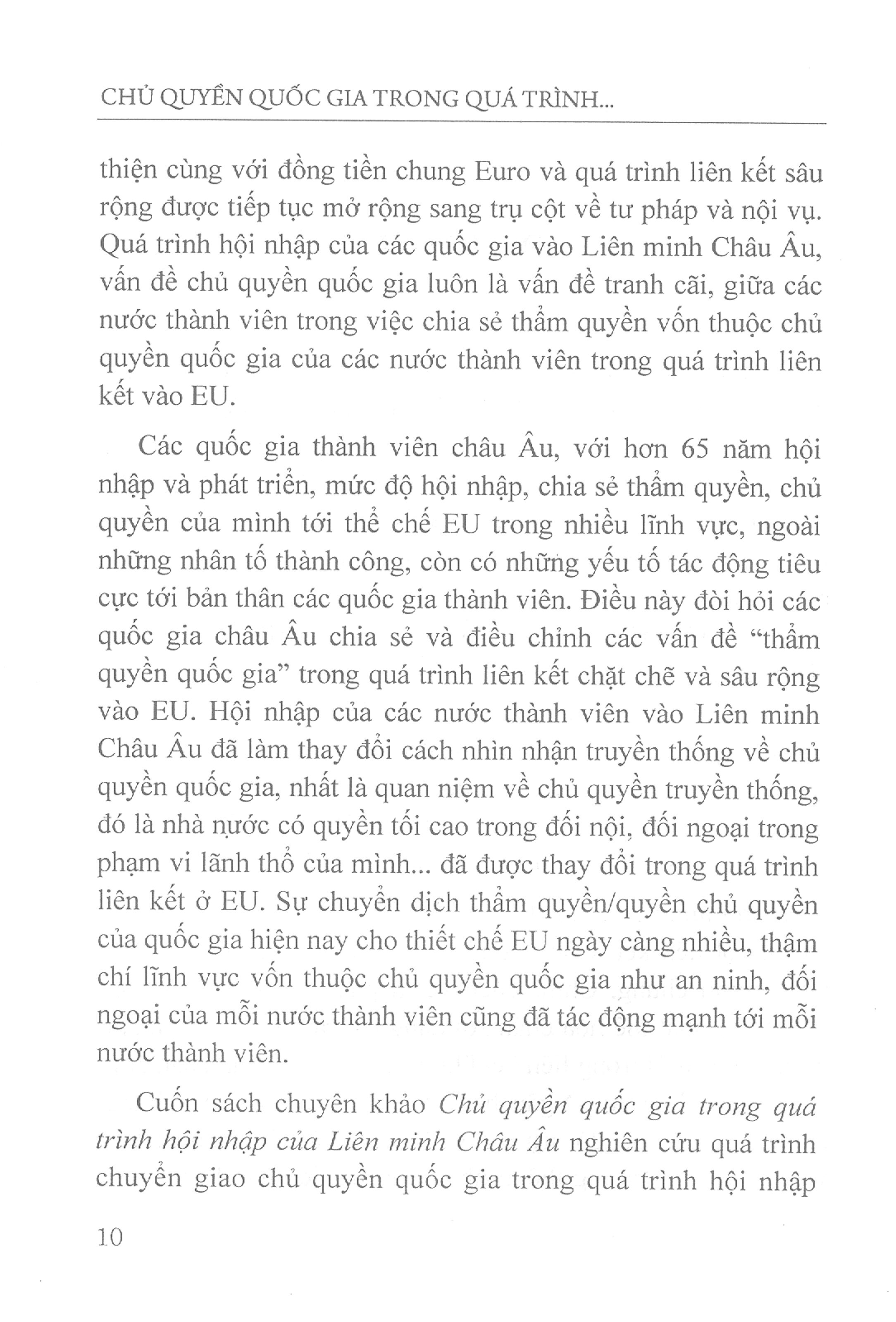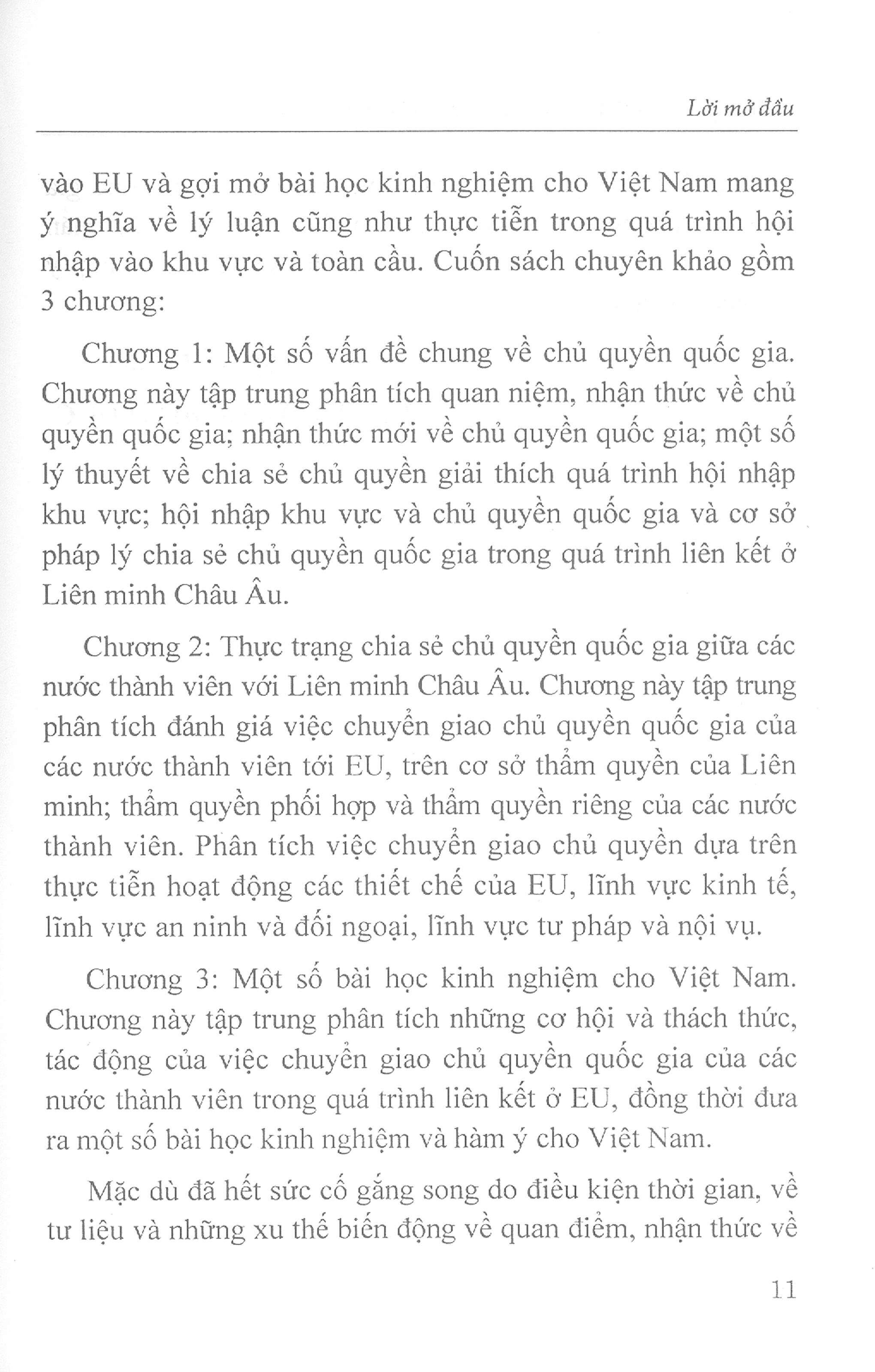 Chương 3: Một số bài học kinh nghiệm cho Việt Nam. Chương này tập trung phân tích những cơ hội và thách thức, tác động của việc chuyển giao chủ quyền quốc gia của các nước thành viên trong quá trình liên kết ở Eư, đồng thời đưa ra một số bài học kinh nghiộm và hàm ý cho Việt Nam.