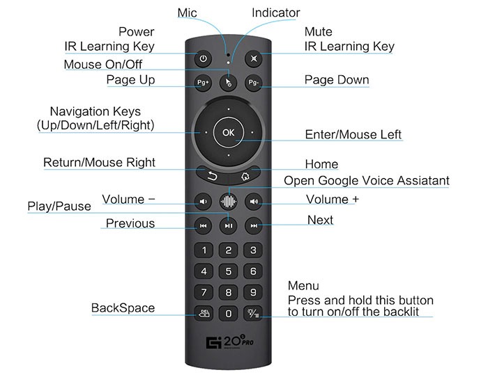 Chuột Bay g20s pro bản cao cấp mic voice có điều khiển giọng nói và chuột bay đèn nền   G20s Pro là phiên bản nâng cấp của G20s, vì vậy ngoài các tính năng cơ bản trên G20s có thì bản G20s Pro này còn có thêm một số chức năng sau: Thêm phím Page Up/Down Thêm phím số Tích hợp chức năng đèn nền để sử dụng trong điều kiện thiếu sángCó thể học lệnh 2 phím hồng ngoại (trên G20s chỉ học được 1 phím) chuột bay tìm kiếm giọng nói Remote Mouse g20spro voice có chức năng điều khiển cử chỉ Sử dụng bộ 6 con quay hồi chuyển gyroscope thao tác rất ổn định Tìm kiếm giọng nói 1 chạm (cơ chế bấm nhả ra lệnh) Lưu ý: Điều khiển giọng nói theo cơ chế Google Voice Assistant Có thể học lệnh 4 Phím ( tiện sử dụng ) Tương thích với nhiều thiết bị sử dụng HĐH Android, máy tính Dùng tốt trên các Android TV Box 6.0 trở lên, đặc biệt là với HĐH AndroidTV Mic thu giọng rất nhạy và chuẩn Chức năng hoạt động: Điều khiển điều hướng, cử chỉ Tìm kiếm giọng nói 1 chạm (cơ chế bấm nhả ra lệnh) Lưu ý: Điều khiển giọng nói theo cơ chế Google Voice Assistant Có thể học lệnh 1 nút Dùng pin sạt rất tiết kiệm về vấn đề sử dụng pin như các điều khiển thông thường khác   Tương thích với nhiều thiết bị sử dụng HĐH Android, máy tính Lưu ý: