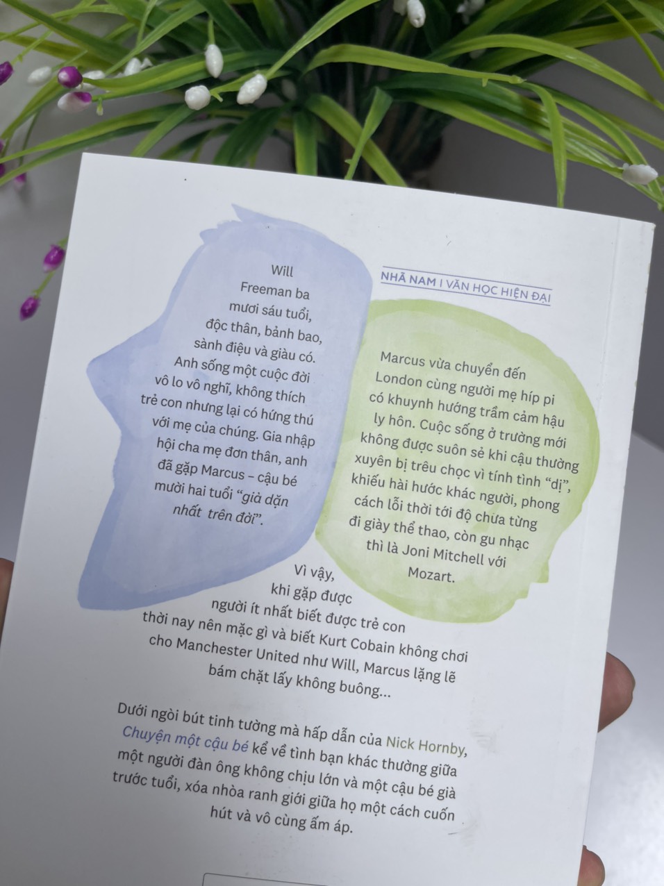 Will Freeman ba mươi sáu tuổi, độc thân, bảnh bao, sành điệu và giàu có. Anh sống một cuộc đời vô lo vô nghĩ, không thích trẻ con nhưng lại có hứng thú với mẹ của chúng. Gia nhập hội cha mẹ đơn thân, anh đã gặp Marcus – cậu bé mười hai tuổi “già dặn nhất trên đời”. ­ Marcus vừa chuyển đến London cùng người mẹ híp pi có khuynh hướng trầm cảm hậu ly hôn. Cuộc sống ở trường mới không được suôn sẻ khi cậu thường xuyên bị trêu chọc vì tính tình “dị”, khiếu hài hước khác người, phong cách lỗi thời tới độ chưa từng đi giày thể thao, còn gu nhạc thì là Joni Mitchell với Mozart. Vì vậy, khi gặp được người ít nhất biết được trẻ con thời nay nên mặc gì và biết Kurt Cobain không chơi cho Manchester United như Will, Marcus lặng lẽ bám chặt lấy không buô Dưới ngòi bút tinh tường mà hấp dẫn của Nick Hornby, Chuyện một cậu bé kể về tình bạn khác thường giữa một người đàn ông không chịu lớn và một cậu bé già trước tuổi, và xóa nhòa ranh giới giữa họ một cách cuốn hút và vô cùng ấm áp. Nicholas Peter John Hornby (sinh năm 1957) là nhà văn và nhà soạn lời người Anh. Là cựu giáo viên ngữ văn tại trường trung học, ngoài tiểu thuyết, ông còn viết sách phi hư cấu, viết tiểu luận, viết báo và viết lời bài hát. Tác phẩm của ông từng lọt vào nhiều danh sách đề cử và đạt một số giải thưởng. Bên cạnh đó, Hornby từng hai lần được đề cử giải thưởng “Kịch bản chuyển thể xuất sắc nhất” của Viện Hàn Lâm cho An Education (2009) và Brooklyn (2015). Ông hiện sống và làm việc tại Highbury, bắc London.
