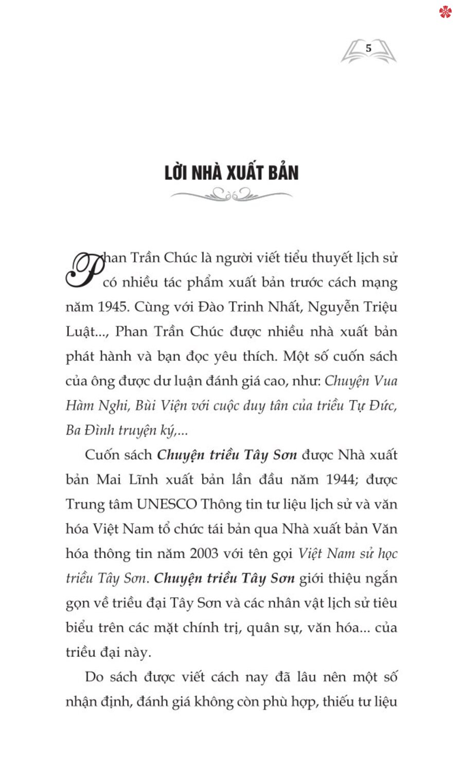Mua tại TiktokCuốn sách Chuyện triều Tây Sơn được Nhà xuất bản Mai Lĩnh xuất bản lần đầu năm 1944; được Trung tâm UNESCO Thông tin tư liệu lịch sử và văn hóa Việt Nam tổ chức tái bản qua Nhà xuất bản Văn hóa thông tin năm 2003 với tên gọi Việt Nam sử học triều Tây Sơn. Chuyện triều Tây Sơn giới thiệu ngắn gọn về triều đại Tây Sơn và các nhân vật lịch sử tiêu biểu trên các mặt chính trị, quân sự, văn hóa... của triều đại này.