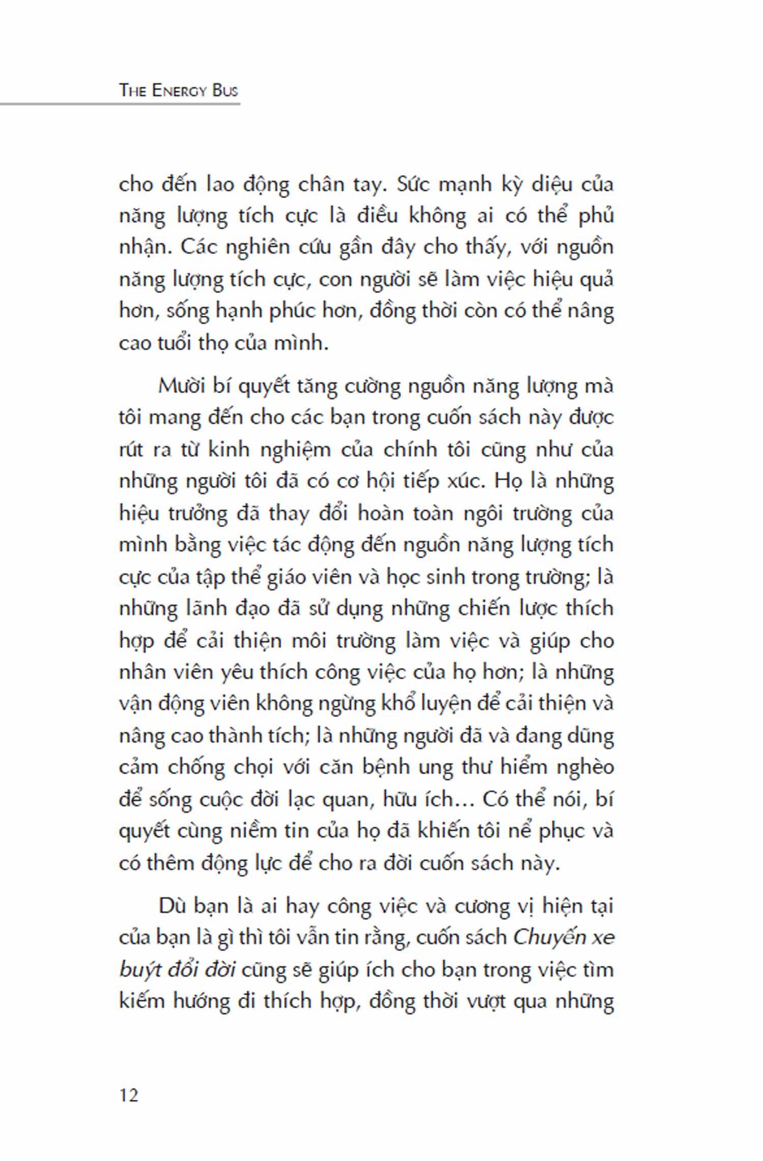 Từ kinh nghiệm của bản thân cũng như những người xung quanh, tác giả Jon Gordon đã tìm ra mười quy tắc giúp mọi người xây dựng nguồn năng lượng tích cực. Các quy tắc được ông truyền tải một cách dễ hiểu thông qua câu chuyện của George trong cuốn sách “Chuyến xe buýt đổi đời” (tái bản từ cuốn Chuyến xe năng lượng).
