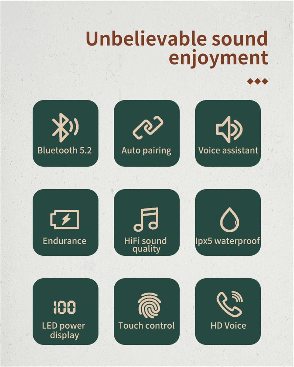 Features: Adopt DSP anti-interference chip and BT5.0 chip, fast and stable transmission, low power consumption. High-quality eight-core 13mm speaker unit, good sound quality, comfortable audio experience. CVC intelligent noise reduction technology can automatically reduct environmental