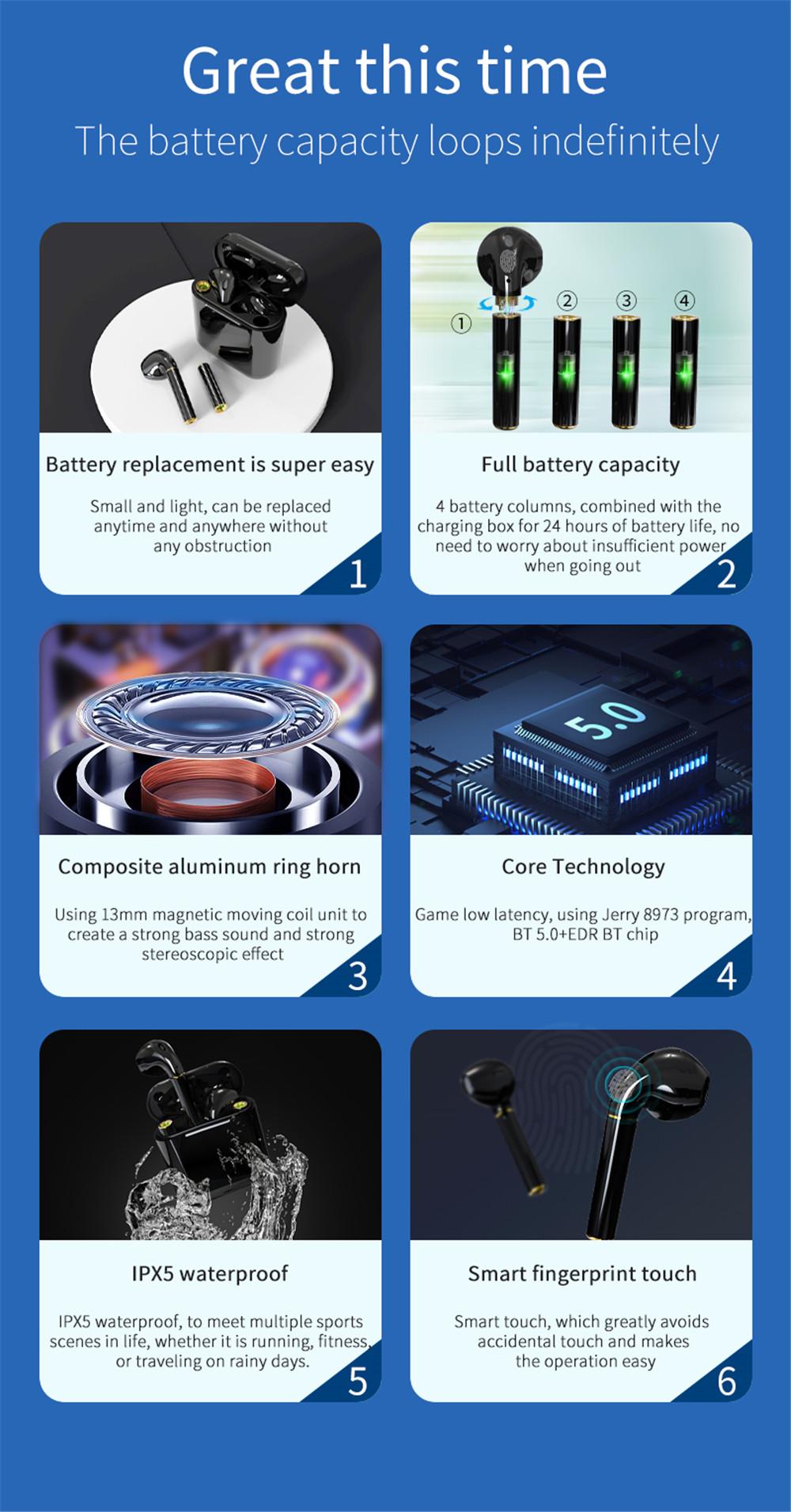 - Dung lượng pin tai nghe: 40mah Pin tai nghe được trang bị 4 pin di động dung lượng lớn, có thể chuyển đổi bất cứ lúc nào