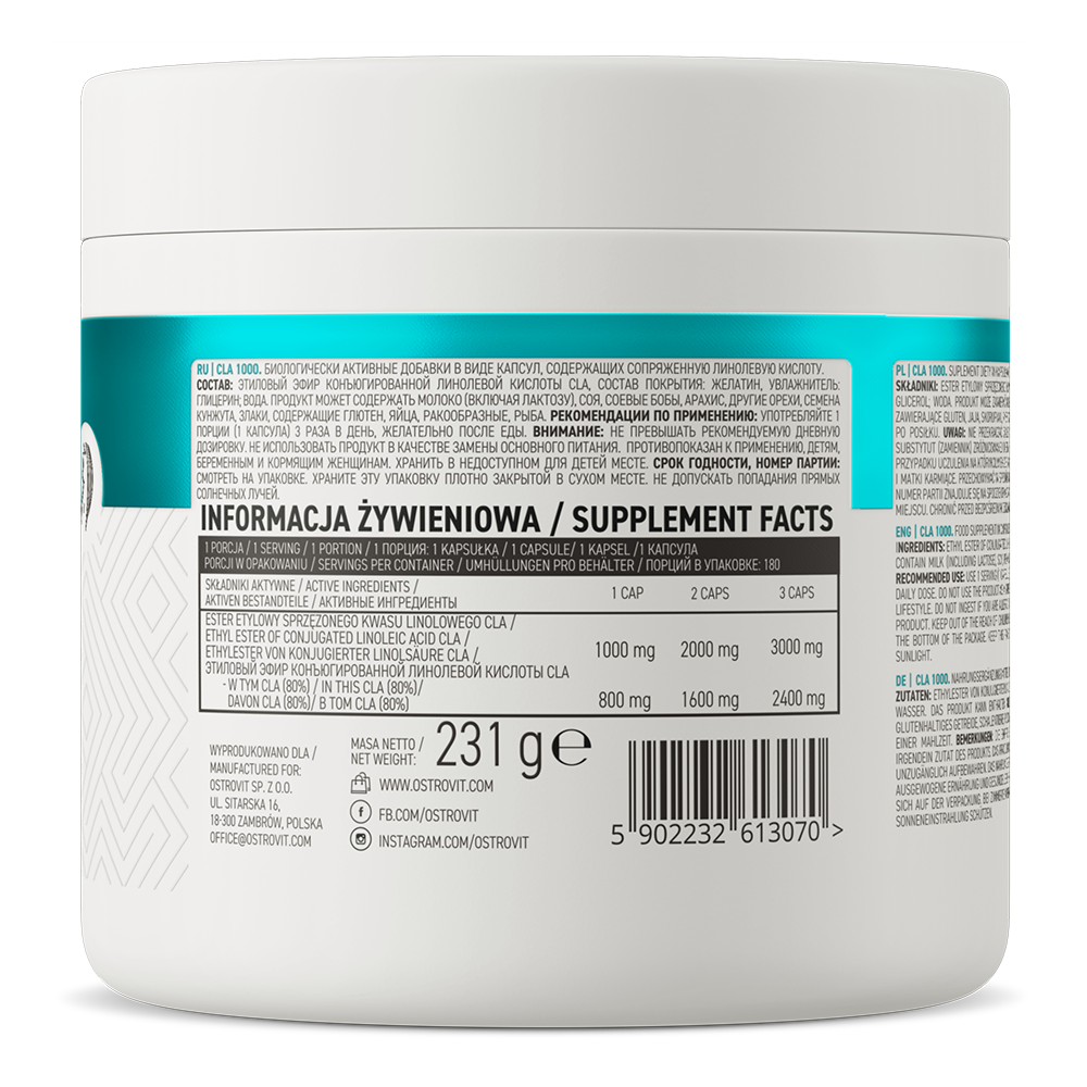 OstroVit CLA 1000 mg 180 viên OstroVit CLA 1000 là thực phẩm bổ sung chất lượng cao nhất có chứa axit linoleic liên hợp (CLA). CLA có tác dụng rất tích cực đối với cơ thể con người. Nó cho thấy một hoạt động hỗ trợ sự phát triển của khối lượng cơ nạc và giúp đốt cháy các mô mỡ dư thừa.