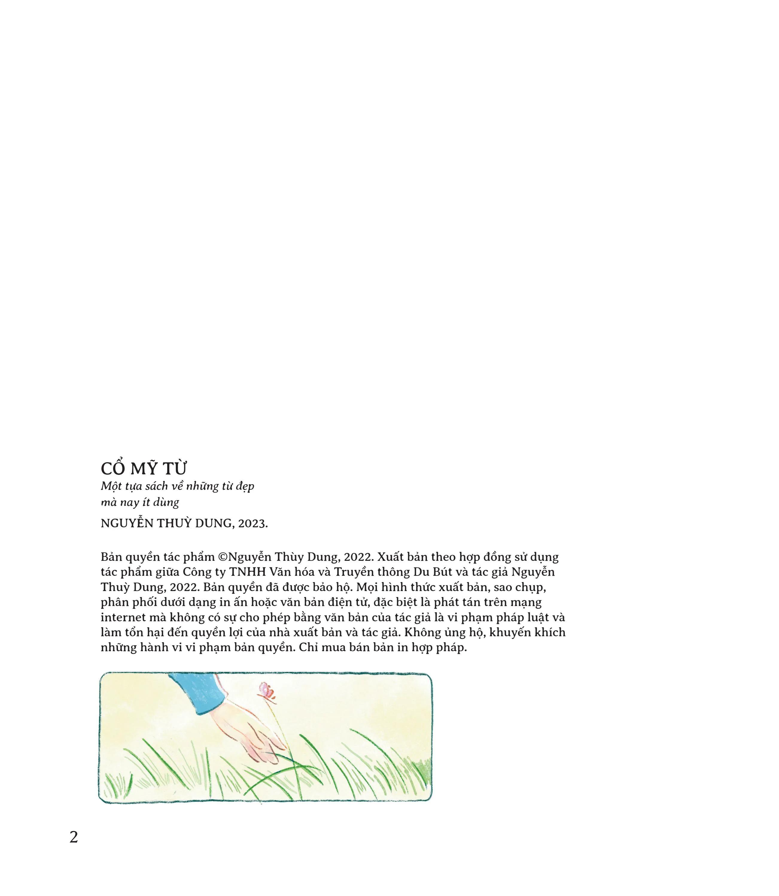 Cổ mỹ từ ở đây là những từ có sắc thái cổ, hiện nay ít dùng nhưng có ý nghĩa đẹp, âm thanh khi đọc lên cũng rất đẹp. 58 từ trong quyển sách này được tác giả Nguyễn Thùy Dung (Ngày ngày viết chữ ) chọn lọc từ các tác phẩm thi văn Việt Nam xưa để giới thiệu đến bạn đọc, rất mong không chỉ có thể làm sống lại một lớp từ cổ kính và ít nhiều khó hiểu nếu không được giải thích, mà còn có thể mang đến cho quý bạn đọc chút niềm hân hoan khi cảm thụ những từ ngữ nhiều sắc thái biểu cảm trong tiếng Việt.