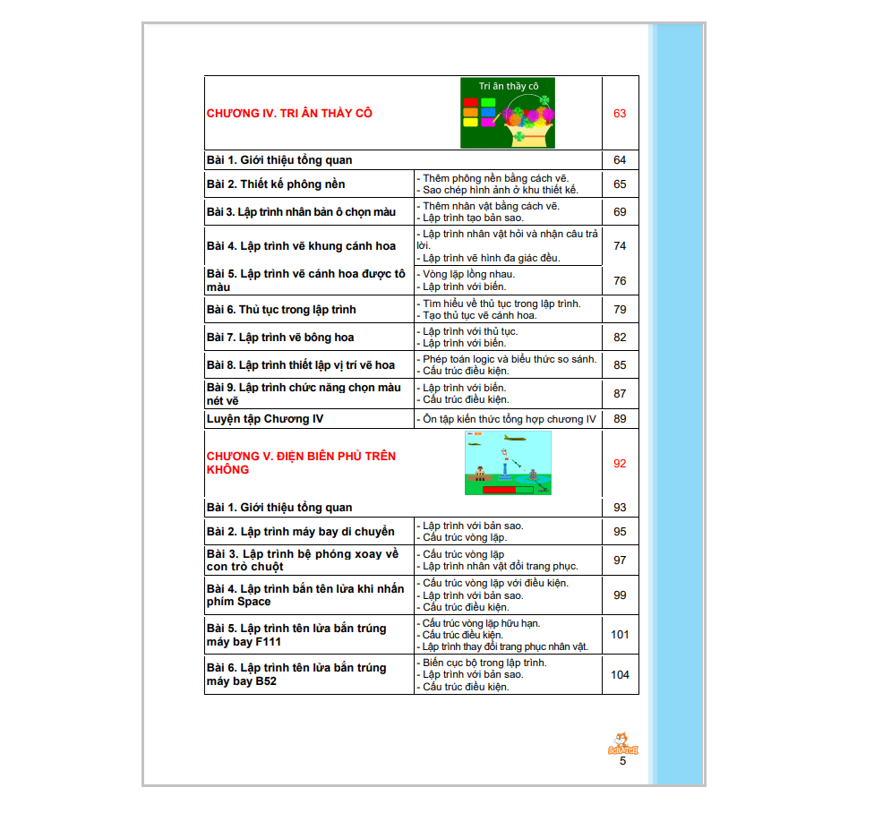 Cuốn sách Coding 5 lập trình với Scratch 3 bao gồm 06 chương, cung cấp những kiến thức tiếp theo về lập trình như: vòng lặp lồng nhau, thủ tục, danh sách, … thông qua ngôn ngữ lập trình Scratch 3. Từng chương trong cuốn sách Coding 5 sẽ giúp trẻ xây dựng lên các phần mềm phù hợp với lứa tuổi và gần gũi với các môn học khác như: Trắc nghiệm tiếng Anh, trò chơi trắc nghiệm, tri ân thầy cô, máy tính bỏ túi, trò chơi Điện biên phủ trên không, dịch ngôn ngữ.