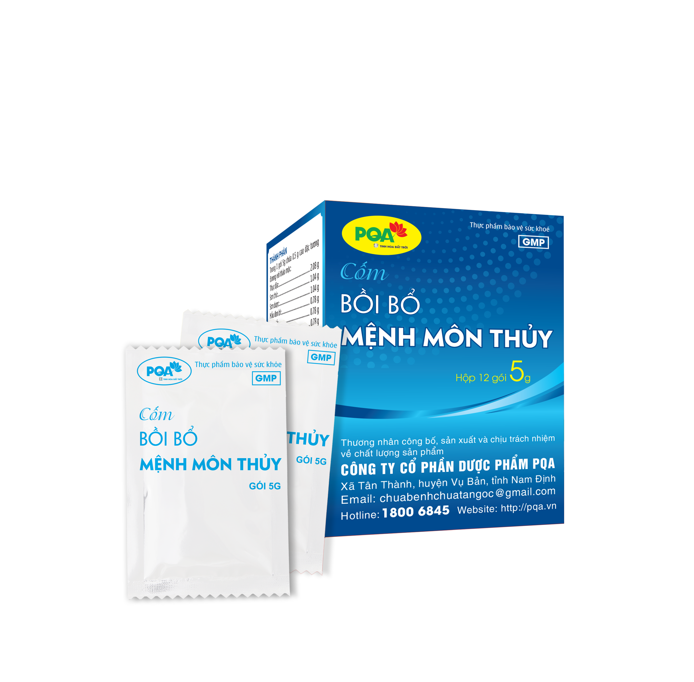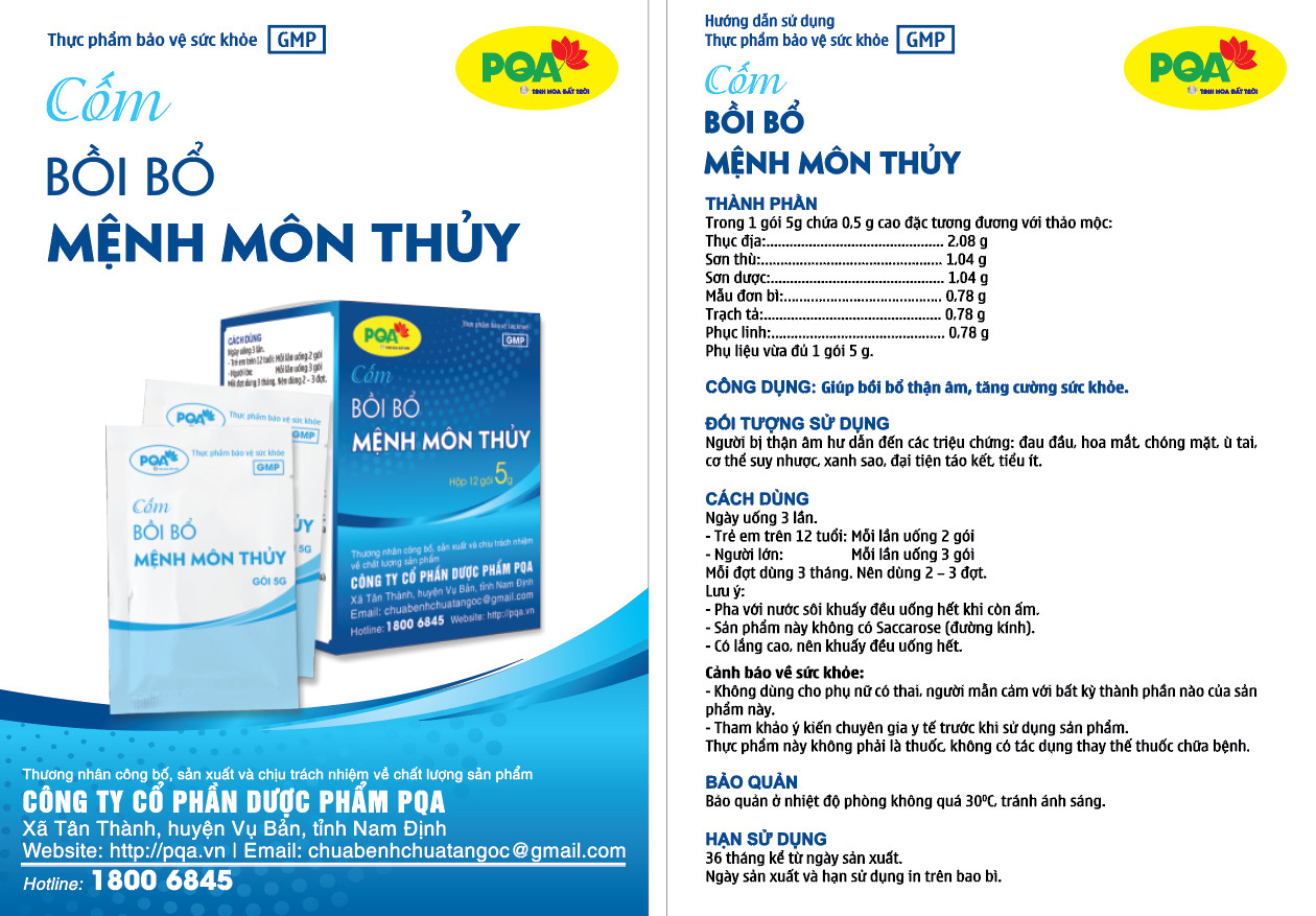 - Trong 1 gói 5g PQA Mệnh Môn Thủy chứa 0,5g cao đặc hỗn hợp thảo mộc thô tương đương: