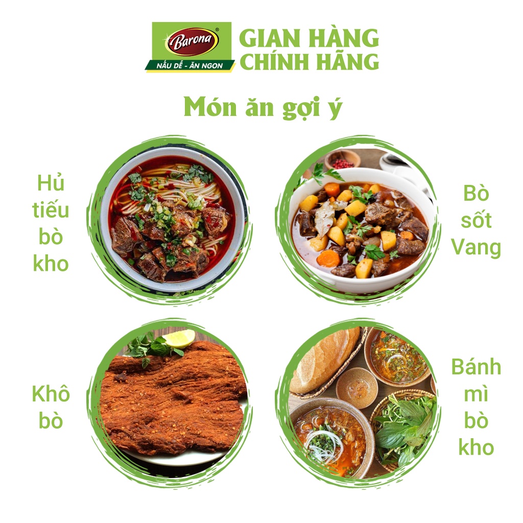 - Đạt Hàng Việt Nam Chất Lượng Cao Xốt Gia Vị Hoàn Chỉnh Barona Bò kho còn dùng để chế biến món Bò xốt vang, Bò kho gừng đều rất ngon QUY CÁCH: 80g/gói x 20 gói/hộp x 4 hộp/thùng HSD: 12 tháng *HƯỚNG DẪN THỰC HIỆN: Khẩu phần 4-5 người Chuẩn bị: