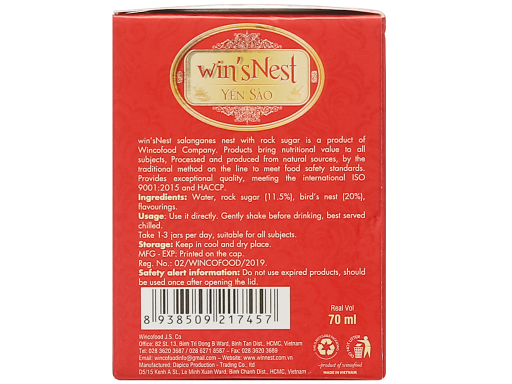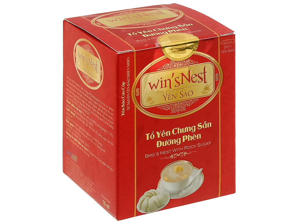 Mua tại TiktokYến sào cao cấp win'sNest tổ yến chưng sẵn đường phèn 20% được sản xuất từ nguồn yến đảo thiên nhiên, là một sản phẩm của công ty wincofood. Được sản xuất bằng phương pháp cổ truyền trên dây chuyền đạt tiểu chuẩn an toàn thực phẩm.