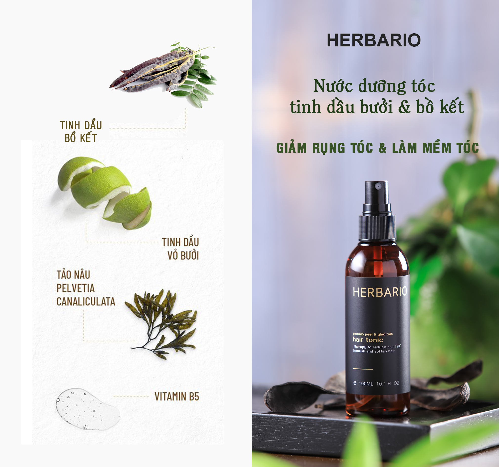 Nước dưỡng tóc vỏ bưởi và bồ kết Herbario 100ml giúp giảm rụng tóc, nuôi dưỡng tóc từ sâu bên trong, cung cấp dưỡng chất giúp tóc chắc khỏe và làm mềm tóc Nước dưỡng