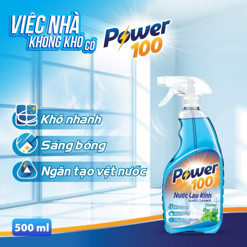 - Nước Lau Kính Power100 Hương Bạc Hà (580ml) với hoạt chất tẩy rửa thông minh, nước lau kính POWER100 sẵn sàng tẩy sạch mọi vết bẩn cứng đầu, giúp bề mặt kính KHÔ NHANH