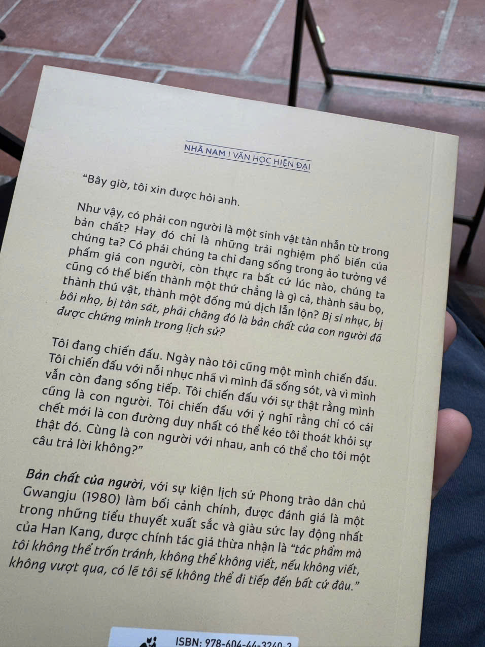 Bản chất của người,với sự kiện lịch sử Phong trào dân chủ Gwangju (1980) làm bối cảnh chính, được đánh giá là một trong những tiểu thuyết xuất sắc và giàu sức lay động nhất của Han Kang, được chính tác giả thừa nhận là “tác phẩm mà tôi không thể trốn tránh, không thể không viết, nếu không viết, không vượt qua, có lẽ tôi sẽ không thể đi tiếp đến bất cứ đâu.”