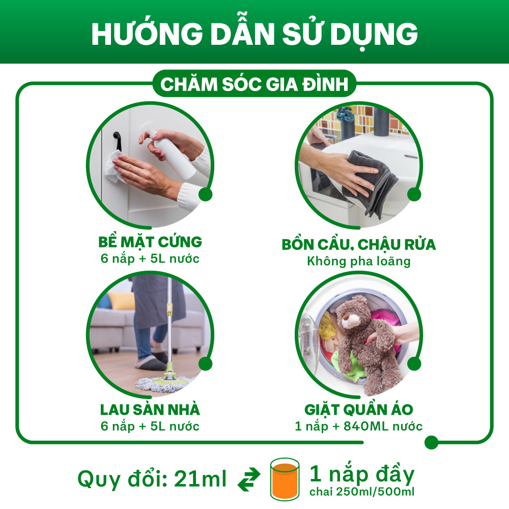 • Giặt: pha 21ml* dung dịch Dettol với 840ml nước.