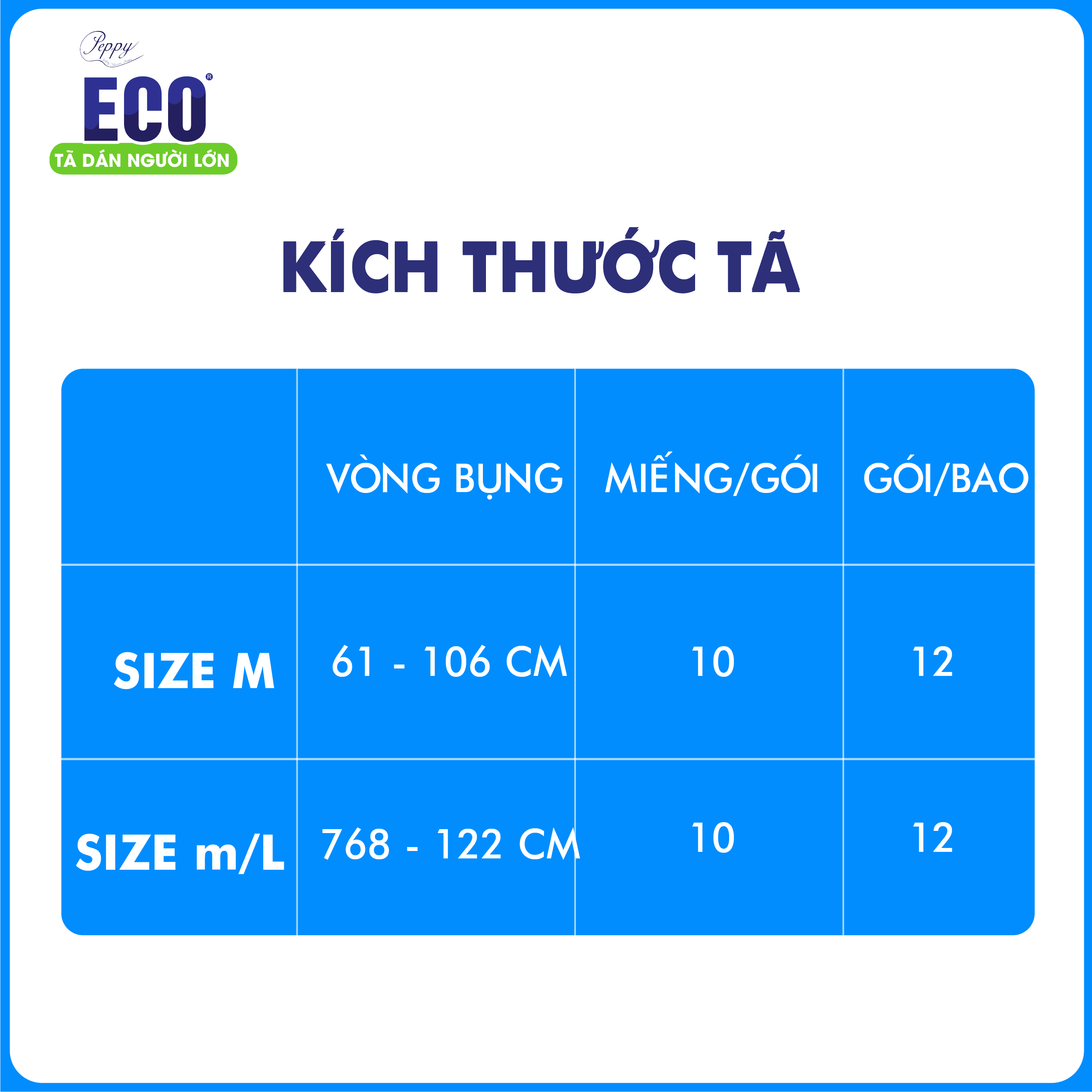 Mua tại TiktokCombo 2 gói Tã Dán Người Lớn Peppy Eco Siêu Mềm Mại, Siêu Khô Thoáng, Kháng khuẩn Size M/L I. MÔ TẢ SẢN PHẨM Tã dán người lớn ECO được thiết kế dành riêng cho người lớn tuổi hạn chế khả năng vận động. Với miếng dán thông minh dễ dàng tháo mở giúp người dùng có thể điều chỉnh kích thước phù hợp với cơ thể mình, đồng thời cũng thuận tiện hơn trong quá trình vệ sinh và thay tã. II. THÔNG TIN SẢN PHẨM Thương hiệu: Xuất xứ: Việt Nam Sản xuất tại: Công ty TNHH Javi - Lô LE6-02 Đường số 2, KCN Xuyên Á, Mỹ Hạnh Bắc, Đức Hòa, Long An Thành phần: Vải không dệt, hạt siêu thấm, bột giấy, thun, keo nóng chảy, màng PE, băng dính,… Quy cách đóng gói: 10miếng/gói Phân loại: Tã dán người lớn III. ĐẶC ĐIỂM NỔI BẬT