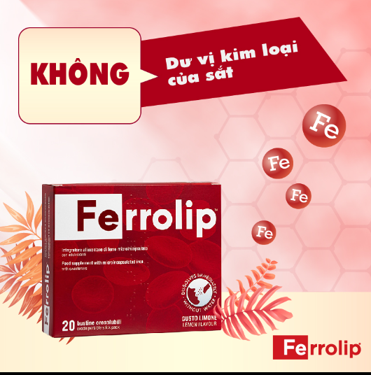 - Nữ giới trong thời kỳ kinh nguyệt có nhu cầu bổ sung sắt Lưu ý: Đối với trẻ dưới 6 tuổi cần tham khảo ý kiến của bác sĩ trước khi sử dụng sản phẩm Ferrolip Thành phần sắt Ferrolip 1 gói bột sắt Ferrolip có chứa: Sắt iii pyrophosphate được bao vi nang (bao màng liposome). Hàm lượng sắt nguyên tốt mỗi gói tương ứng 30mg. Phụ liệu: tinh bột ngô, chất nhũ hóa: lecithin, chất điều chỉnh độ chua: axit citric; chất điều hương; chất ổn định: silicon dioxide; chất tạo ngọt: sorbitol, maltodextrin, sucralose, acesulfame K. Tham khảo: Công dụng sắt Ferrolip Bổ sung sắt cho cơ thể. Hỗ trợ tạo hồng cầu, giúp giảm nguy cơ thiếu máu do thiếu sắt. Ferrolip có tốt không? Thực phẩm bổ sung sắt Ferrolip được các bác sĩ của nhiều bệnh viện lớn tại Hà Nội tin tưởng sử dụng để bổ sung sắt cho các đối tượng. Liều dùng, hướng dẫn sử dụng và cách bảo quản Ferrolip Liều dùng Ferrolip Khuyến nghị sử dụng: 1 gói Ferrolip/ngày. Sản phẩm có thể sử dụng trực tiếp à không cần hòa tan với nước. Ferrolip có dạng bột có vị chanh dễ chịu, không tanh, không dư vị kim loại. Hướng dẫn sử dụng Sử dụng trực tiếp: Đổ từ từ gói Ferrolip vào miệng. Sắt Ferrolip với dạng buccal sẽ tan ngay trong miệng mà không để lại dư vị kim loại như các sản phẩm bổ sung sắt khác trên thị trường. Cách bảo quản Bảo quản nhiệt độ phòng, nơi khô thoáng, tránh ánh nắng mặt trời. Để xa tầm tay trẻ em. Sản phẩm có hạn dùng 36 tháng kể từ ngày sản xuất. Ngày hết hạn xem tại “Best before end” trên vỏ hộp sản phẩm.