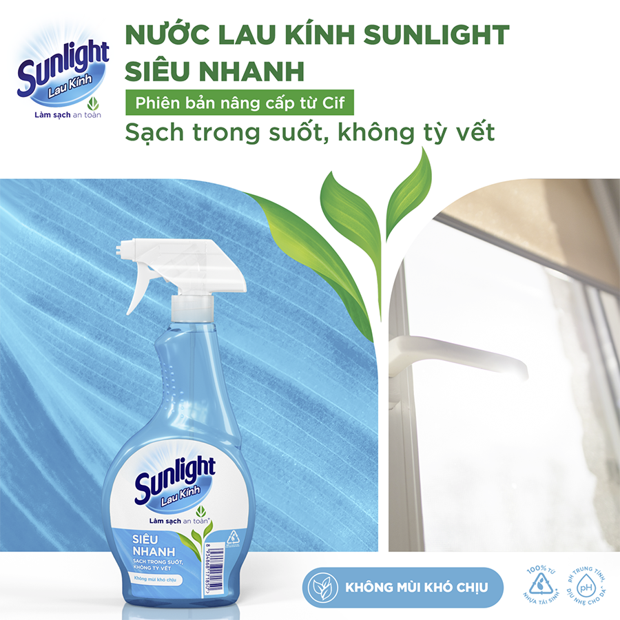 NƯỚC LAU KÍNH SUNLIGHT SIÊU NHANH - SẠCH TRONG SUỐT, KHÔNG TỲ VẾT Tạm biệt mọi vết bẩn, làm sạch mặt kính hiệu quả và nhanh chóng với nước lau kính Sunlight. Sản phẩm không