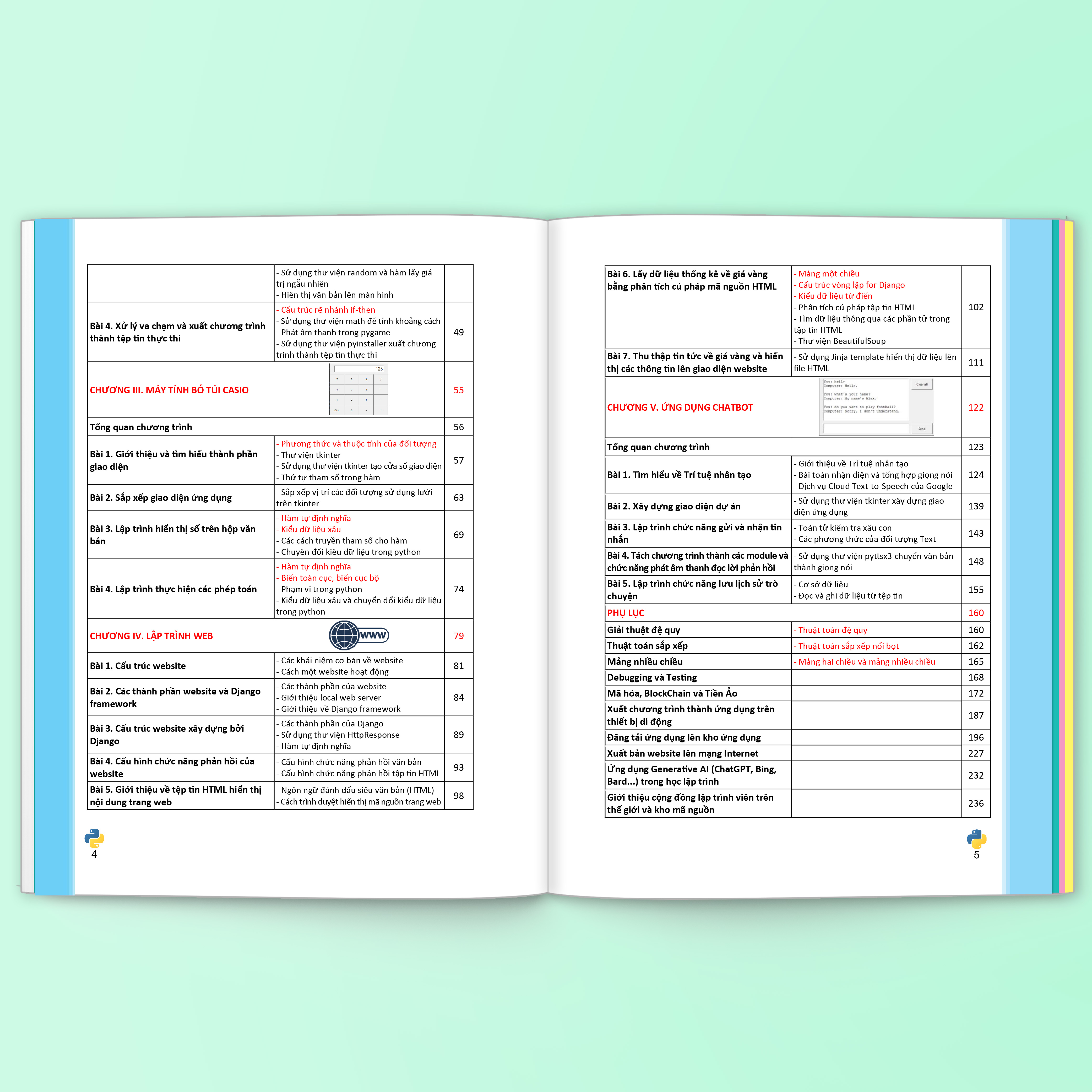 - Chương 5: Tìm hiểu về Trí tuệ nhân tạo và ứng dụng các thư viện có sẵn để xây dựng một ChatBot với Python.