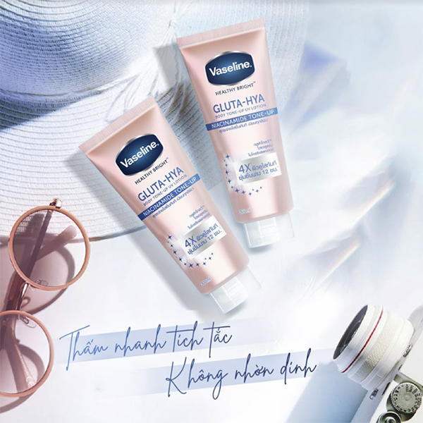 Sữa dưỡng thể ban ngày Vaseline Gluta-Hya Serum Burst UV Lotion Flawless Bright có chứa glutathione hiệu quả trên da cao gấp 10 lần vitamin C giúp các đốm đen, sạm nám, vùng da không