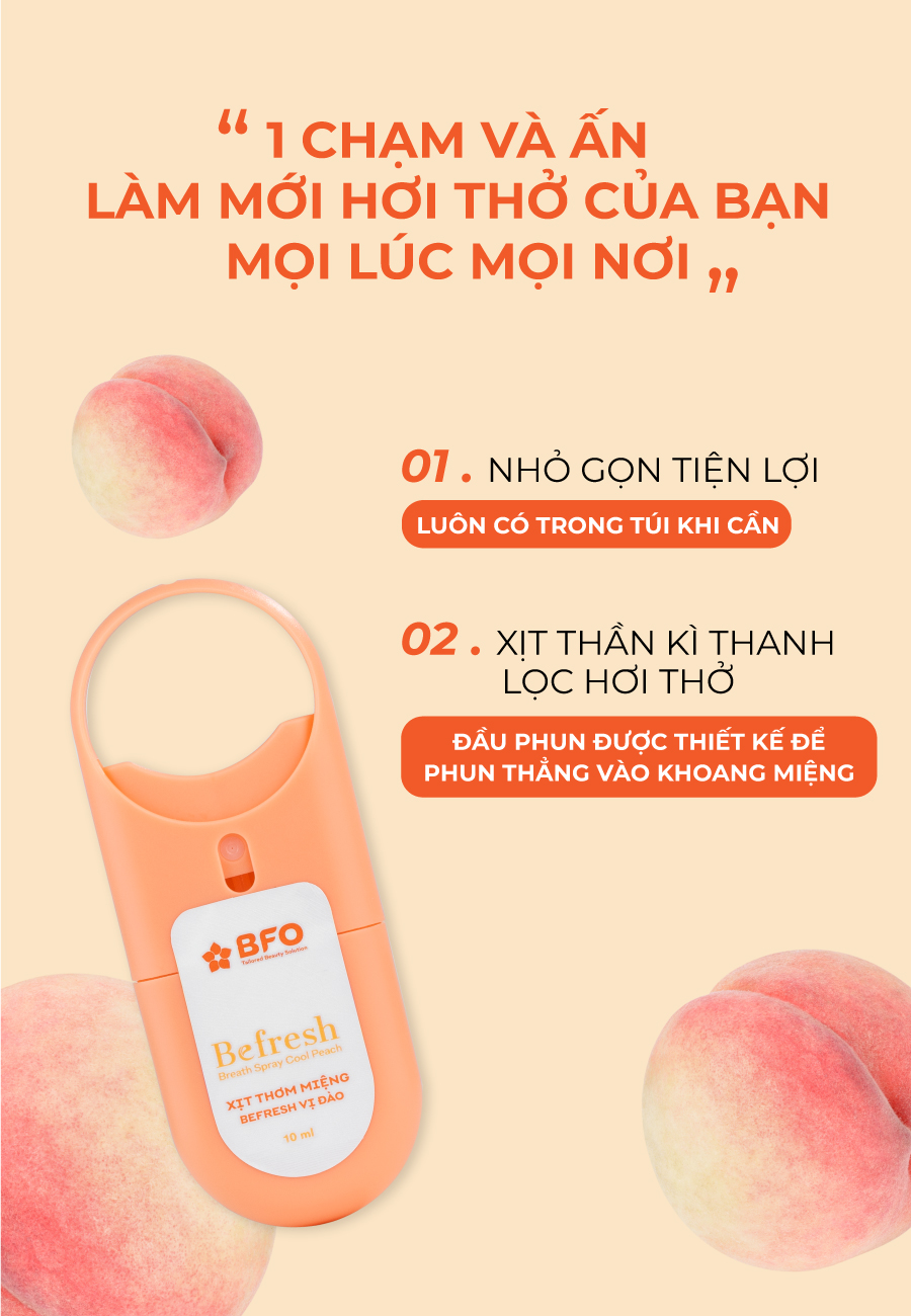 Combo 2 Xịt Thơm Miệng Befresh Cho Hơi Thở Thơm Mát Chỉ Trong 3 Giây Dung Tích 10ml ƯU ĐIỂM NỔI BẬT: Khử mùi hôi trong khoang miệng nhanh chóng chỉ trong 3 giây, giúp hơi thở thơm mát, sảng khoái. Chiết xuất từ tinh dầu trà xanh - bạc hà hoàn toàn thiên nhiên, cho hương thơm tự nhiên, không nồng, không khó chịu, an toàn khi nuốt. Thiết kế nhỏ gọn, tiện lợi, luôn sẵn sàng bên bạn trong bất kỳ cuộc hẹn nào. Sản phẩm không thể thay thế kem đánh răng và nước súc miệng, do đó bạn nên kết hợp đánh răng, súc miệng và xịt miệng để đảm bảo sức khỏe răng miệng và tự tin với khoang miệng sạch thơm suốt ngày dài. THÀNH PHẦN: Tinh dầu bạc hà có công dụng khử mùi hôi, hỗ trợ làm sạch răng miệng. Tinh dầu trà xanh giúp ngăn ngừa sâu răng, hạn chế các vấn đề về nướu và chân răng. Vị the mát sảng khoái giúp giảm căng thẳng, tăng cường năng lượng, kích thích sự tập trung tinh thần. MÙI HƯƠNG 4 LOẠI: VỊ ĐÀO ️ VỊ DÂU BẠC HÀ TRÀ XANH - BẠC HÀ DƯA LƯỚI HƯỚNG DẪN BẢO QUẢN: Đậy nắp kín sau khi sử dụng. Bảo quản nơi khô ráo, thoáng mát. Tránh nhiệt độ cao. Tránh ánh nắng trực tiếp. Xuất xứ: Việt Nam THÔNG TIN THƯƠNG HIỆU: Thương hiệu BFO: Tự hào là chuỗi cửa hàng cung cấp các sản phẩm chăm sóc và làm đẹp toàn diện, giá tốt, chất lượng độc tôn trên toàn Châu Á. Với niềm tin mãnh liệt trong từng sản phẩm tạo ra, BFO hy vọng mang lại những trải nghiệm tốt nhất cho người tiêu dùng: HIỆU QUẢ - TỐI GIẢN - THOẢI MÁI.