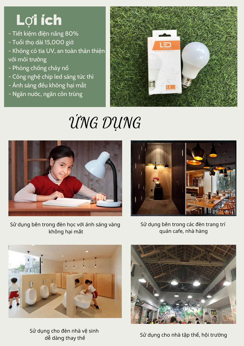 Đèn sử dụng rất đơn giản, dễ dàng thay thế, với chi phí tiết kiệm, thời gian sử dụng lâu dài, tiêu hao ít điện năng, thuận lợi trên mọi điều kiện địa hình. Đặc biệt với những vùng nông thôn, vùng sâu vùng xa việc lắp những bóng đèn led bulb này rất phổ biến.