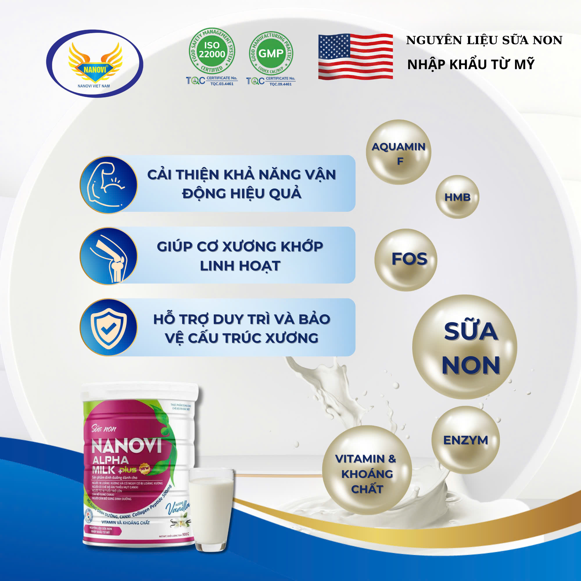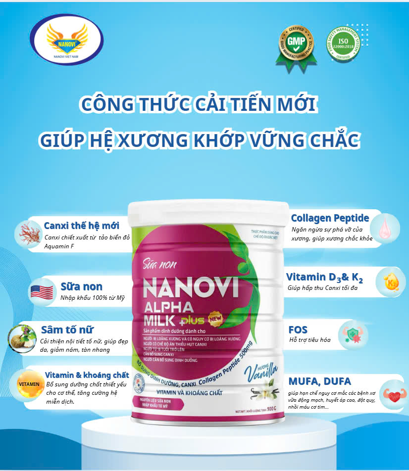 - Đối tượng: Chuyên biệt dành cho người loãng xương, thiếu hụt canxi Sữa Non NANOVI ALPHA MILK PLUS bổ sung 50 vitamin và khoáng chất giúp cung cấp năng lượng cần thiết cho cơ thể, hỗ trợ hấp thu Canxi giúp hệ xương chắc khỏe, cùng với sự kết hợp độc đáo của chất xơ FOS giúp cải thiện hệ tiêu hóa- CUNG CẤP NĂNG LƯỢNG CẦN THIẾT CHO CƠ THỂ, DƯỠNG CHẤT ĐỦ ĐẦY CHO GIẤC NGỦ THÊM NGON. QUYỀN LỢI KHI MUA HÀNG