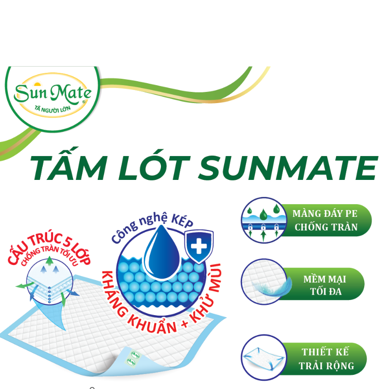 Combo 3 Tấm lót SunMate cải tiến mới (45 x 70cm)Giới thiệuSản phẩm tấm lót SunMate dành cho cả nam và nữ, phù hợp với người hạn chế khả năng đi lại. Hạt gel tác động kép siêu thấm hút và kháng khuẩ...