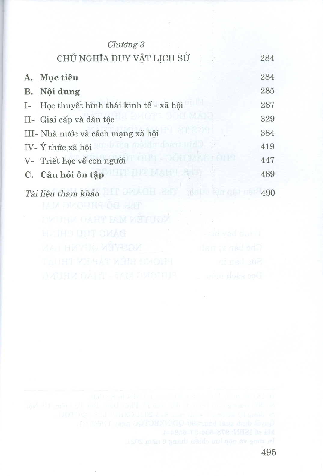 Chương 3 trình bày những nội dung cơ bản của chủ nghĩa duy vật lịch sử, gồm: vấn đề hình thái kinh tế - xã hội; giai cấp và dân tộc; nhà nước và cách mạng xã hội; ý thức xã hội; triết học về con người.