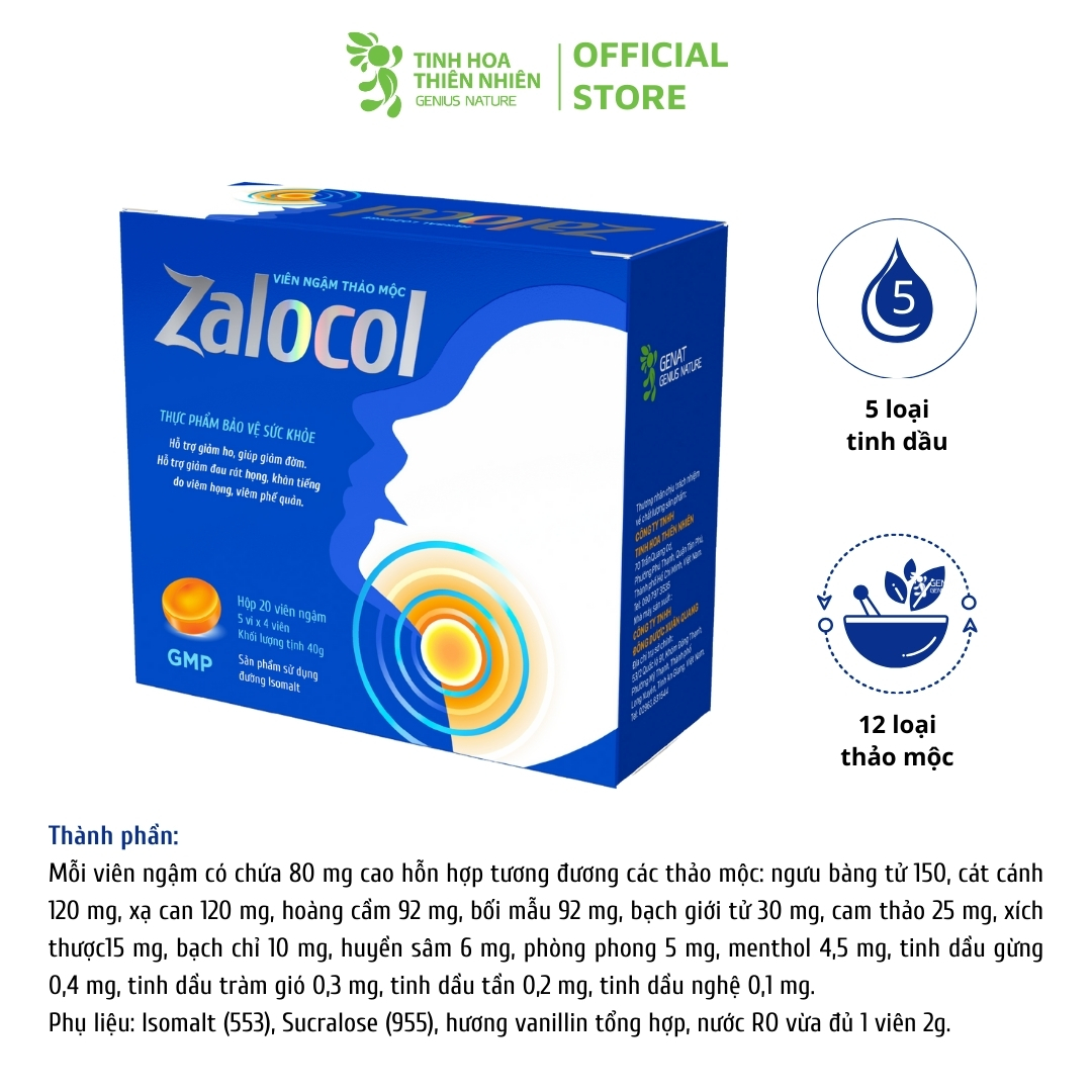 Combo 45 hộp viên ngậm thảo mộc Zalocol Hỗ trợ giảm ho, giảm đờm, giảm đau rát họng, khản tiếng - Genat Thành phần: Mỗi viên ngậm có chứa 80 mg cao hỗn hợp tương