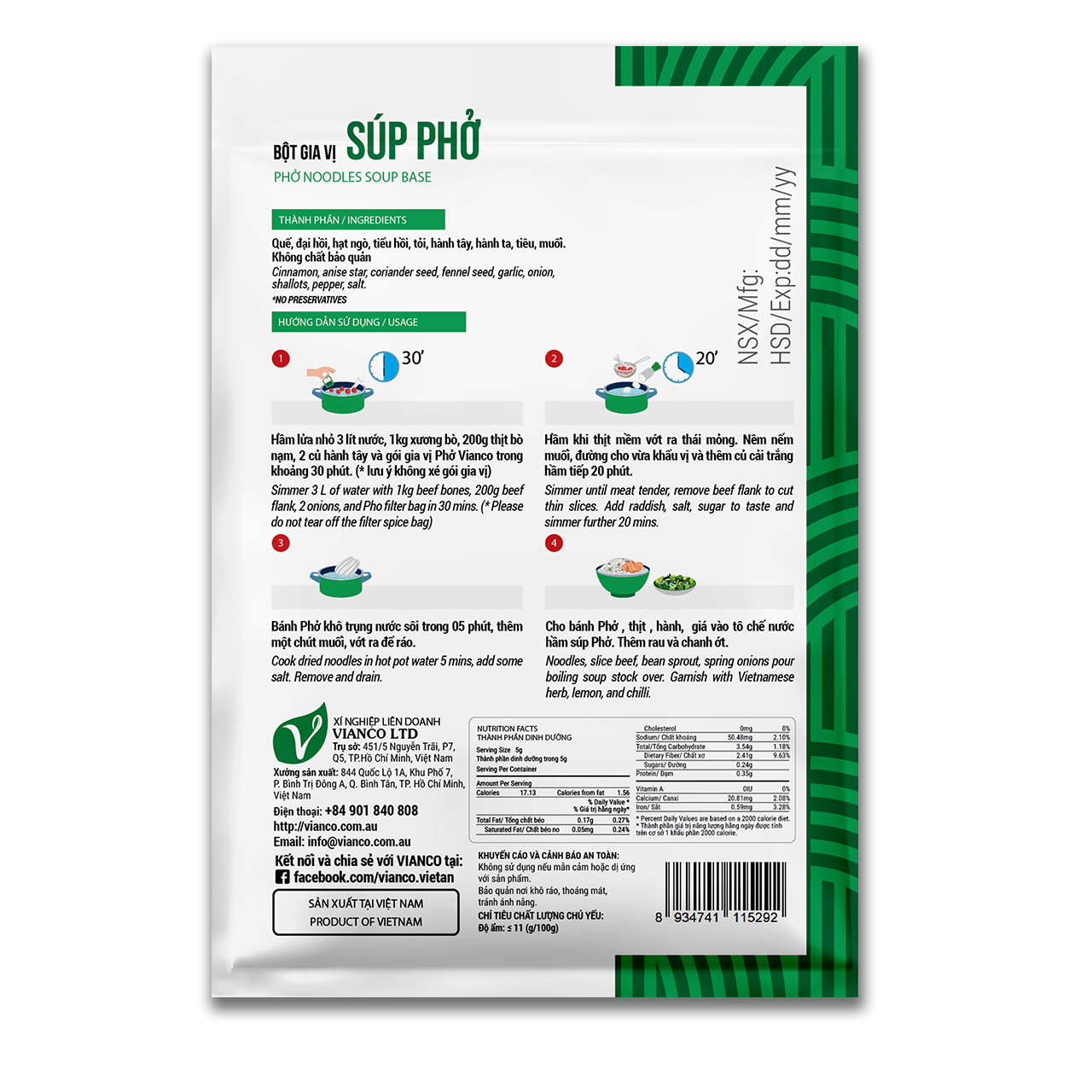 - Cách dùng: Cho vào nồi khoảng 3 lít nước, thêm 1kg xương bò, 200g thịt bò nạm, 2 củ hành tây, gói gia vị Nước Súp Phở ViancoFoods, nấu lửa nhỏ, hầm từ 30 phút trở lên cho đến khi thịt nạm mềm. Khi hầm xong, vớt thịt nạm ra thái miếng mỏng. Cho thêm củ cải trắng, muối, đường nêm cho hợp khẩu vị và nấu thêm 20 phút. Thịt bò thái miếng mỏng trụng sơ qua nồi nước lèo làm thịt bò tái. Cho bánh Phở vào tô, giá chín, xếp thịt bò nạm, thịt bò tái trên mặt với hành lá, ngò và chế nước súp phở vào tô. Phở Bò có thể ăn với rau ngò gai, rau quế, giá và thêm 1 miếng chanh, ớt cho ngon miệng.