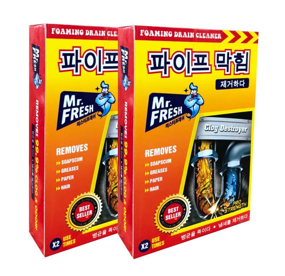 Thông Tin Sản Phẩm Tên Sản Phẩm : Hộp bột thông cống Mr Fresh Hàn Quốc 200gCông dụng : Thông tắc ống cống , ống thoát nước.Thành phần : Sodiumhydrochlorite, sdiumhydroxide, sodium silicate, hidrotrope, blodegradeble surfactant 99%Hướng dẫn sử dụng : - Cắt chéo miệng túi, đổ hạt bột vào xô nhựa, hòa tan với khoảng nửa lít nước, đổ dung dịch vào cổ ống nơi bị tắc nghẽnĐể từ 1 – 3 giờ rồi xả mạnh nước cho chảy đi (tốt nhất là đổ buổi tối, để tới sáng hôm sau mới xả mạnh nước hoặc dùng thụt cao su thụt cho chảy đi).Kích thước : 14,6 x 9,7 x 3,2 cmTrọng lượng : 200gHình thức đóng gói : 2 gói 100g/hộpMàu sắc : Hộp Đỏ (gói bên trong màu bạc)Xuất xứ : Mr Fresh - Hàn Quốc Bột thông tắc đường ống thoát nước Mr.Fresh Hàn Quốc là một trong những sản phẩm tốt nhất được bán chạy ở Hàn Quốc với công thức tiên tiến, các thành phần hóa học chuyên dụng, độ tẩy cực mạnh sẽ xoáy tan mọi cặn bẩn trong đường ống một cách hiệu quả.Sản phẩm sẽ thông sạch mọi loại cặn bẩn như giấy, rác, rau, mỡ, thịt, gạo, tóc… kẹt trong đường ống thoát nước của chậu rửa nhà bếp, lavabo, bồn tắm… mà không làm hư hại đường ống và các thiết bị vệ sinh.Bột thông tắc đường ống thoát nước Mr.Fresh Hàn Quốc trong thành phần của nó luôn có các hỗn hợp hóa học có độ kiềm, độ ăn mòn, độ phân hủy cực cao, giúp phân hủy các hợp chất hữu cơ, chất cặn bã có trong đường ống gây tắc nghẽn. ƯU ĐIỂM NỔI BẬT CỦA BỘT THÔNG TẮC VỆ SINH THÔNG CỐNG HÀN QUỐC MR.FRESH : – Sử dụng dễ dàng– Xóa bỏ sự lo lắng tắc đường ống cống, tắc bể phốt.– Nhanh chóng và tiện lợi cho việc chăm sóc gia đình.– Phân hủy và làm mềm các chất hữu cơ gây tác nghẽn đường ống như: rêu, rác, thức ăn thừa, mỡ, cọng rau, tóc và các xác động vật– Công thức tẩy sạch vết bẩn cứng đầu nhanh chóng– Không để lại mùi khó chịu như các sản phẩm thông thường– Giúp bồn cầu và ống dẫn nước thải luôn sạch sẽ, vệ sinh HƯỚNG DẪN CÁCH SỬ DỤNG Bột thông tắc đường ống thoát nước Mr.Fresh Hàn Quốc Cắt chéo miệng túi, đổ hạt bột vào xô nhựa, hòa tan với khoảng nửa lít nước, đổ dung dịch vào cổ ống nơi bị tắc nghẽnĐể từ 1 – 3 giờ rồi xả mạnh nước cho chảy đi (tốt nhất là đổ buổi tối, để tới sáng hôm sau mới xả mạnh nước hoặc dùng thụt cao su thụt cho chảy đi)Bột thông tắc đường ống thoát nước Mr.Fresh Hàn Quốc đã và đang được sử dụng nhiều ở những đơn vị lớn như khách sạn , nhà hàng..