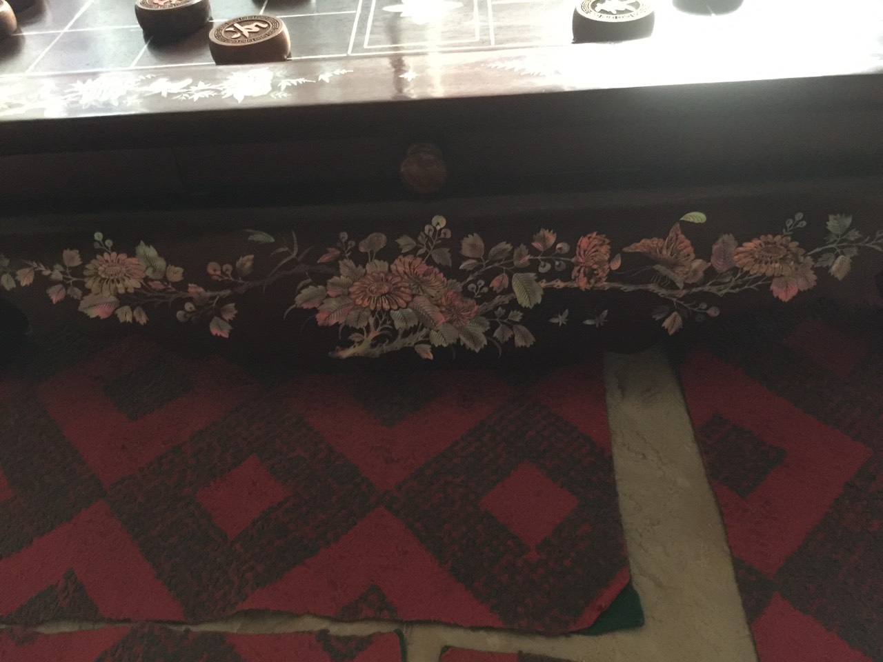 _ Bàn cờ tướng chân cuốn thư có ngăn kéo được làm bằng chất liệu gỗ hương tự nhiên 100%  _ Kích thước ngang 50 dài 56 cao 7cm _ Bàn cờ tướng được thiết