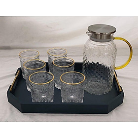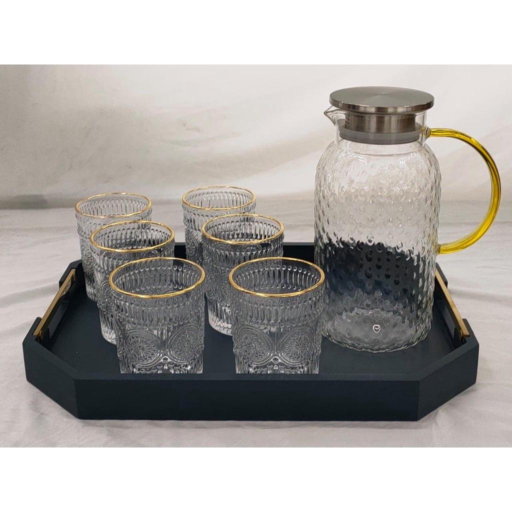 Bộ bình thuỷ tinh chịu nhiệt màu vàng gôn kèm 6 cốc phong cách Bắc Âu tạo ra một cảm giác sang trọng và vô cùng hiện đại