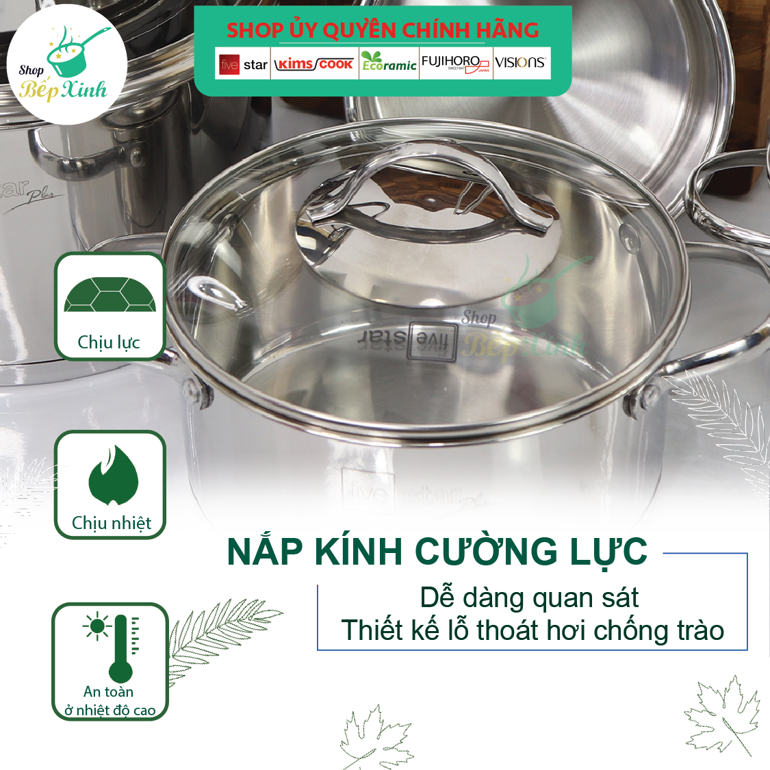Bộ nồi FiveStar Plus FS08CG-304 inox 304 3 đáy bếp từ 4 chiếc nắp kính