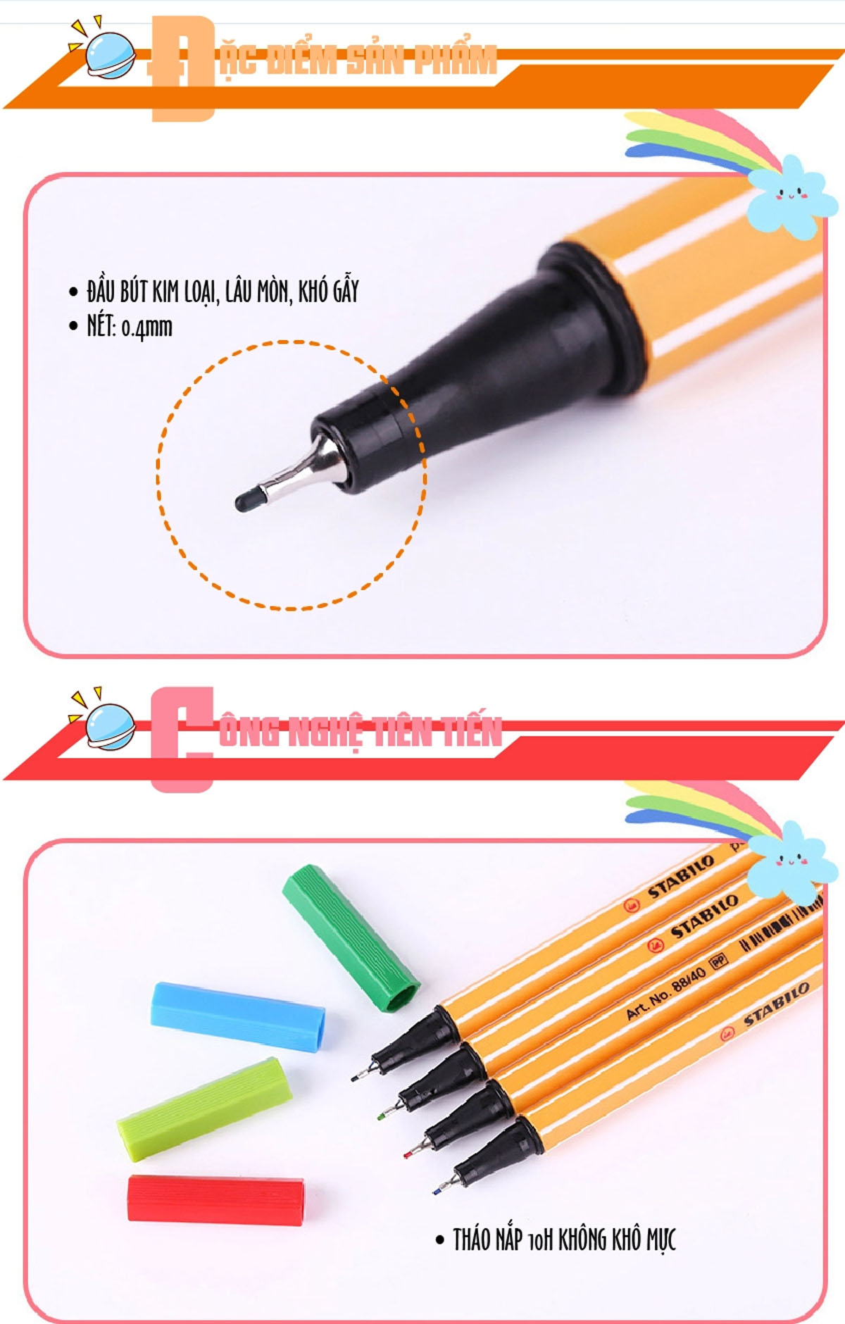- Bút kim đa năng: viết, vẽ, phác thảo, tô màu - Đầu bút bọc kim, giúp viết lâu mòn và khó bị thụt vào trong - Viết trơn, không đọng mực trên giấy -