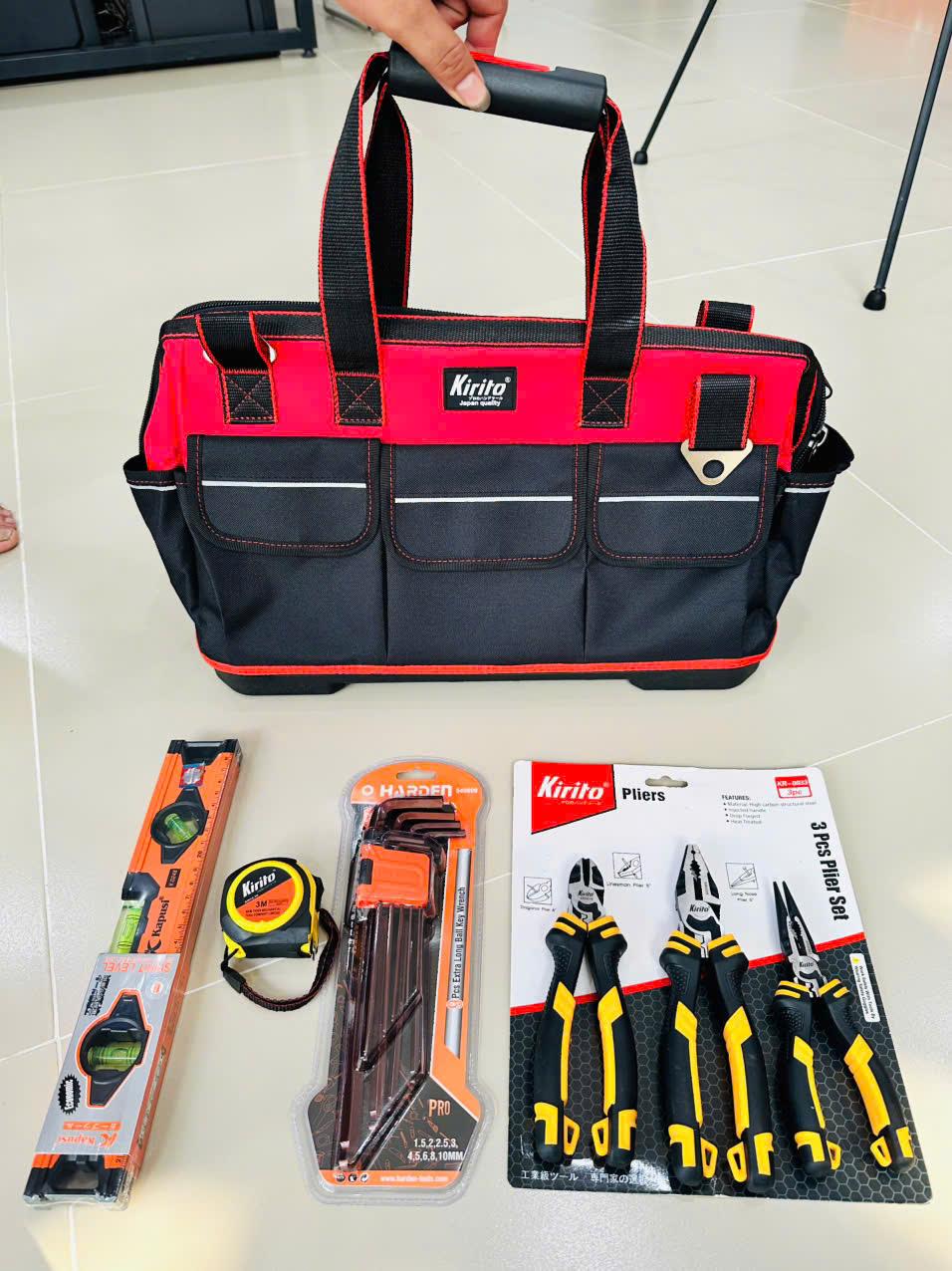 Mua tại TiktokCOMBO ĐỒ NGHỀ SỬA CHỮA TIỆN LỢI – PHÙ HỢP CHO THỢ & HỘ GIA ĐÌNH Túi đựng đồ nghề 20 inch – Thiết kế rộng rãi, đế nhựa giúp tăng độ bền và giữ dáng túi – Có 8 ngăn bên trong + 8 ngăn bên ngoài, giúp sắp xếp dụng cụ gọn gàng, dễ tìm ️ Bộ kìm CRV Kirito gồm: – Kìm điện 8 inch – Kìm cắt 7 inch – Kìm nhọn 6 inch – Chất liệu thép CRV cứng cáp, phù hợp nhiều công việc cơ bản Bộ lục giác màu nâu dài cao cấp – Thiết kế cầm chắc tay, dễ thao tác Thước cuộn 3m + Thước thủy 30cm – Đầy đủ cho các nhu cầu đo đạc thông thường Sản phẩm phù hợp sử dụng cá nhân hoặc công việc sửa chữa cơ bản