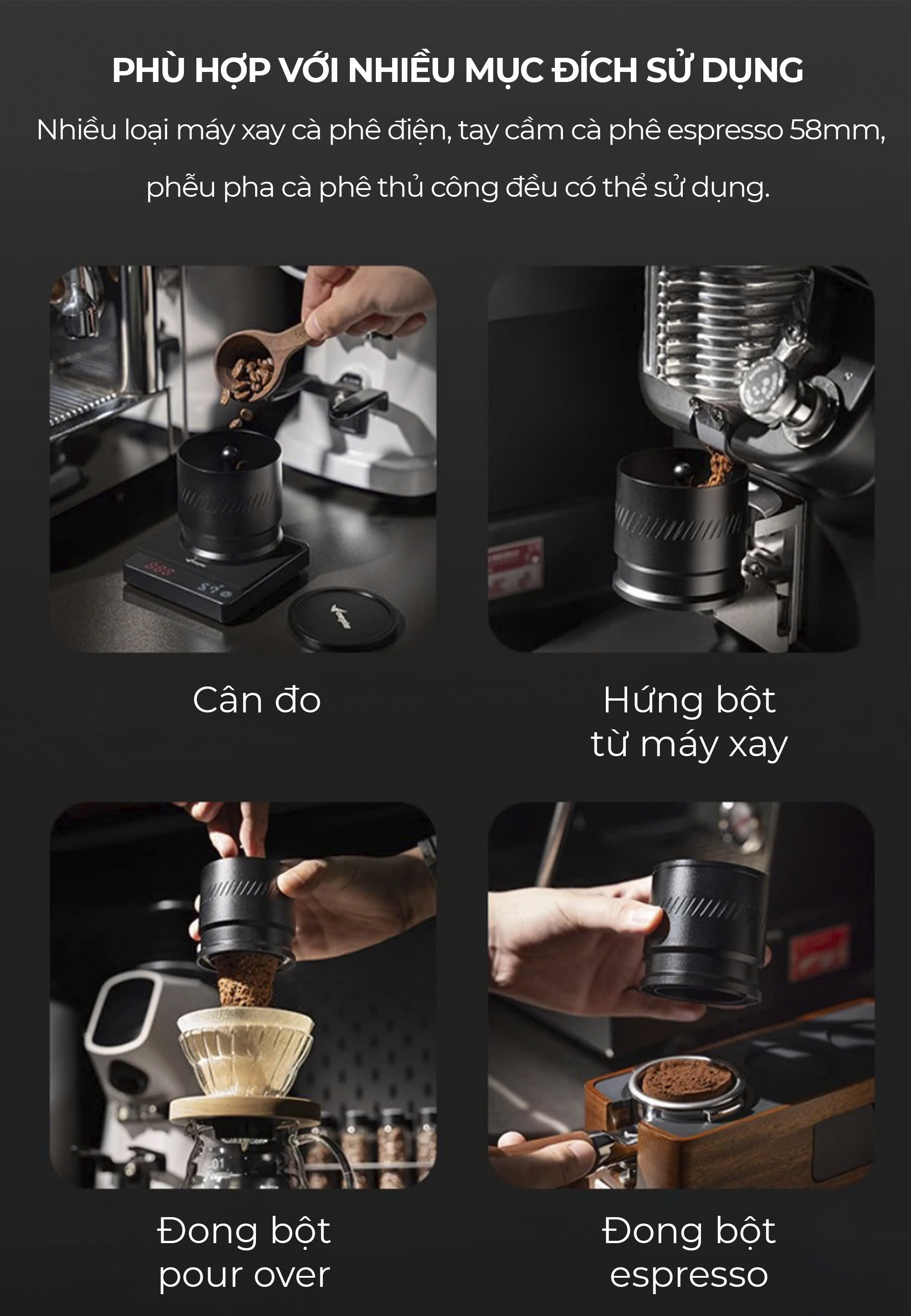 - Dosing hứng đong cà phê THOR • Thiết kế nghiêng dễ đổ bột, hạn chế bắn tung • Phân phối bột đều, chuẩn từng shot