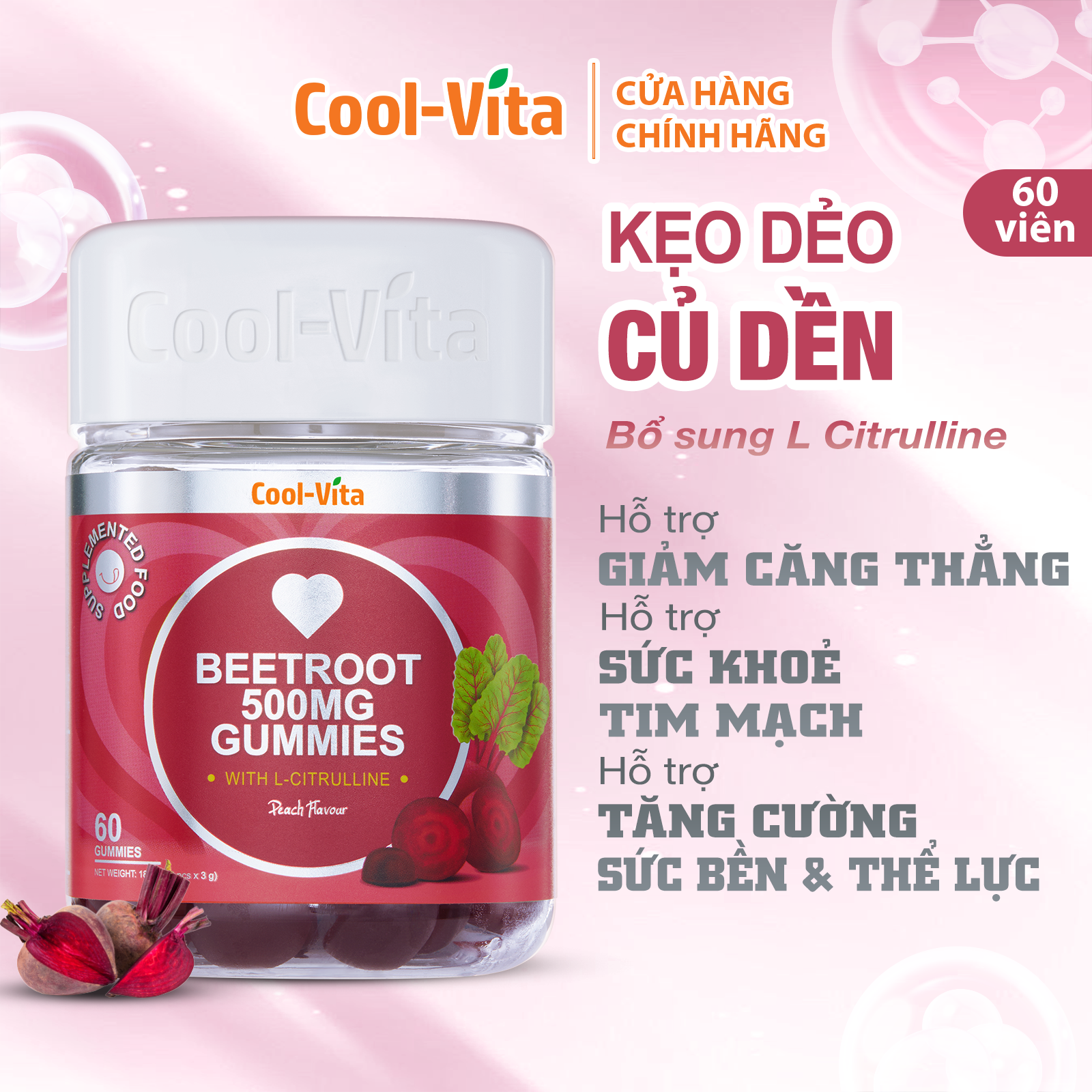 ++++++++++ Kẹo Dẻo Củ Dền Hỗ Trợ Sức Khỏe Tim Mạch & Hỗ Trợ Tăng Cường Sức Bền Vị Đào Kết Hợp L-Citrulline Coolvita (60 viên x 3g)/hộp ++++++++++