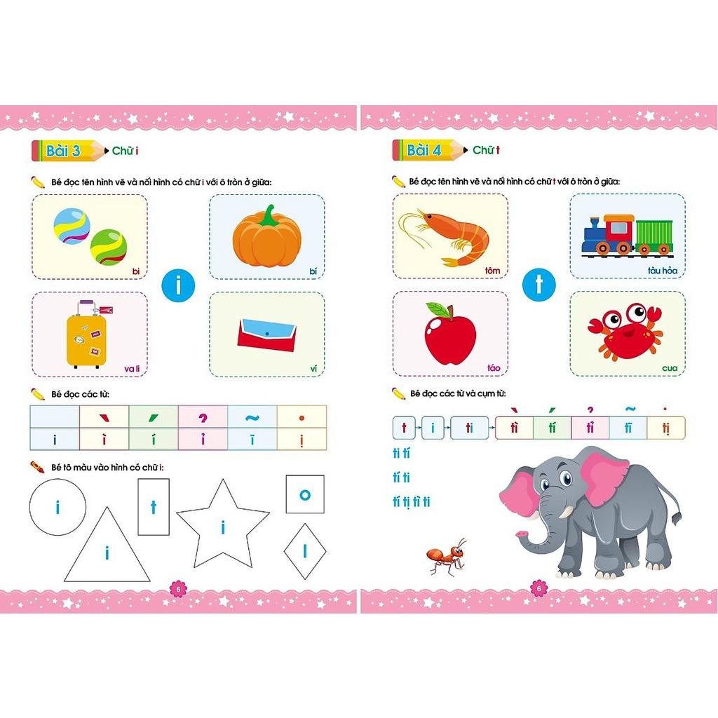 Sách gồm những bài học từ cơ bản đến nâng cao. Có các bài nối hình, ghép vần, tập đọc câu