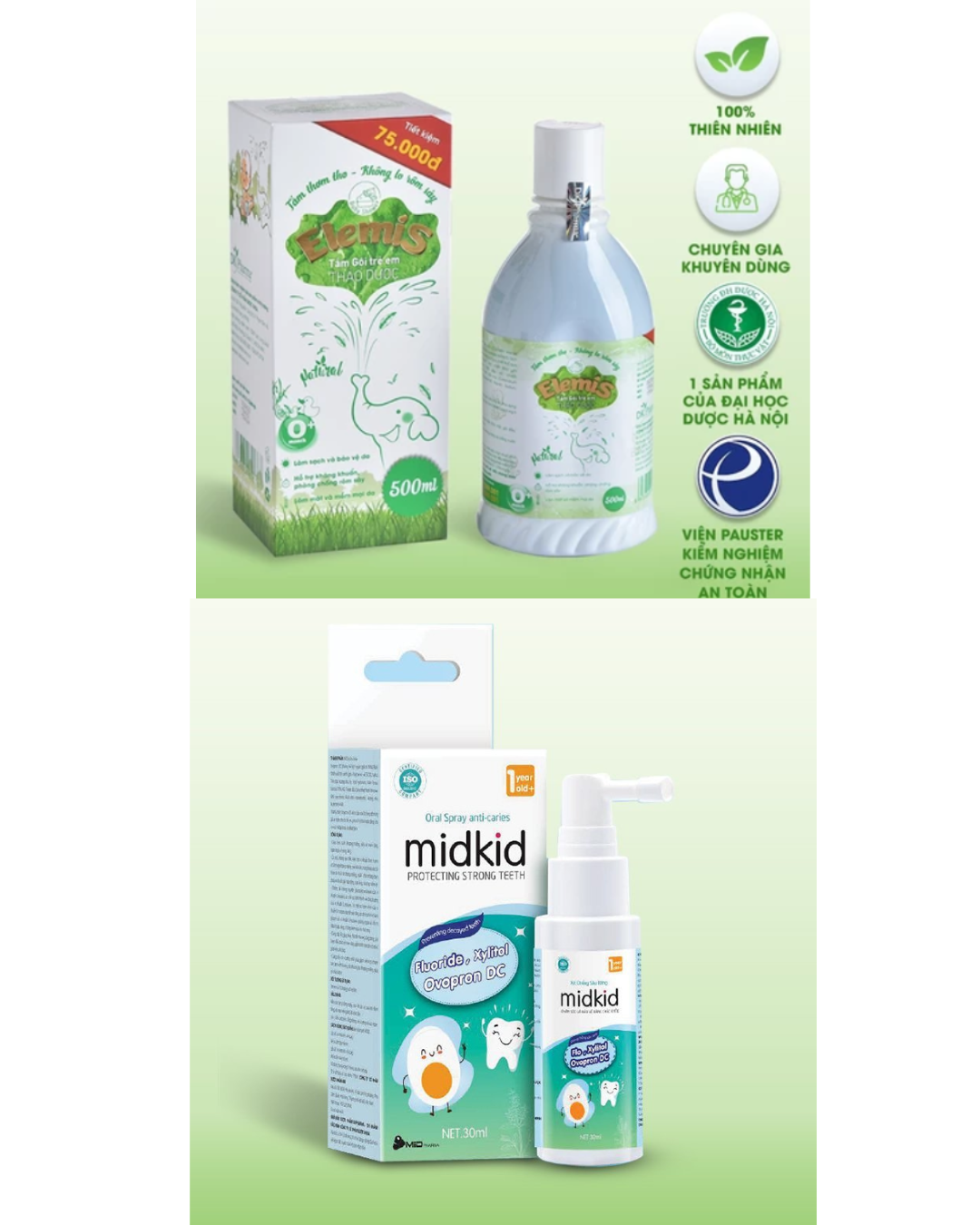 - Cách tắm: Dung dịch dùng tắm gội toàn thân. Rửa mặt, gội đầu, ngâm người bé trong nước tắm. Trong trường hợp rôm sảy, mụn nhọt: xoa trực tiếp ELEMIS lên vùng da bị rôm sảy, mụn nhọt khoảng 1 – 2 phút, sau đó tắm bé trong nước tắm đã pha. Tắm, gội xong lau khô người không tráng lại bằng nước thông thường. Bảo quản: Để nơi khô mát, tránh ánh sáng Quy cách đóng gói: Hộp 1 lọ x 200ml NSX xem trên bao bì HSD 2 năm kể từ ngày sản xuất II. MIDKID Thành phần :