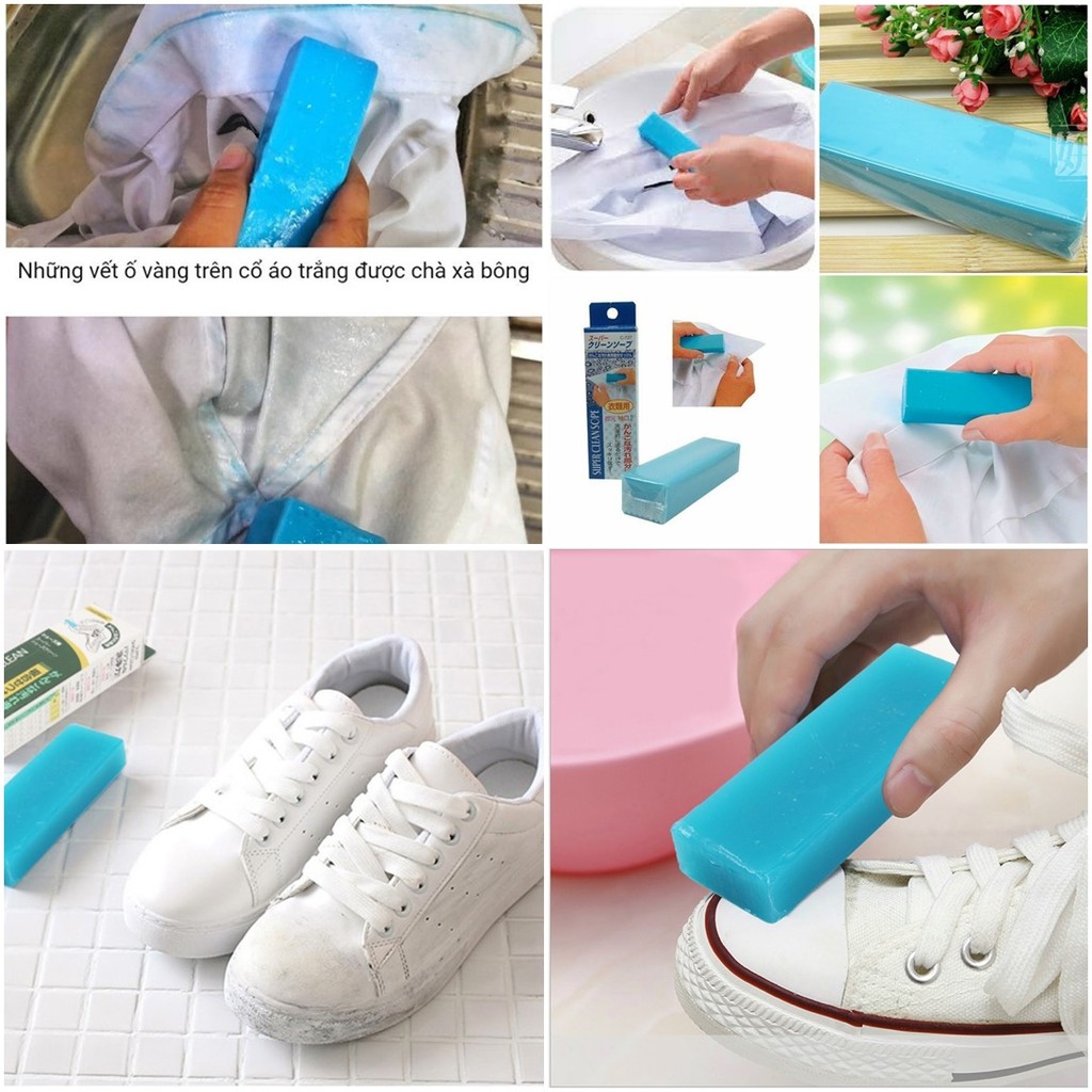 - Giặt tay: 5L nước, dùng 12 ml nước tẩy. 1L nước, dùng 10 ml nước tẩy. Chú ý khi sử dụng: Không sử dụng với nước nóng. Sau khi sử dụng, rửa tay bằng xà phòng. Nên sử dụng găng tay nếu tiếp xúc trong thời gian dài. Không sử dụng với lụa, chất pha nilon, vải polyurethane, acetate. Thanh Xà phòng Giặt Cổ Áo, Tay Áo 100g Xuất xứ: Nhật Bản/ Made in Japan Trọng lượng: 100g Công dụng: Sản phẩm giúp dễ dàng loại bỏ các vết bẩn hiệu quả, đặc biệt là vùng cánh tay và cổ áo… Chỉ cần thấm ướt quần áo, chà nhẹ sản phẩm lên những chỗ có vết bẩn và ngâm, rồi giặt (giặt tay hay giặt máy đều được). Thanh tẩy vết bẩn nhật giúp bạn dễ dàng loại bỏ các vết bẩn nơi cổ áo và cổ tay áo một cách hiệu quả, đặc biệt là vùng cánh tay và cổ á Giữ cho áo quần luôn sạch sẽ. Giặt sạch hiệu quả các vết bùn, dầu khoáng, cafe, nước tương, vết máu, trên vải sợ Hướng dẫn sử dụng: