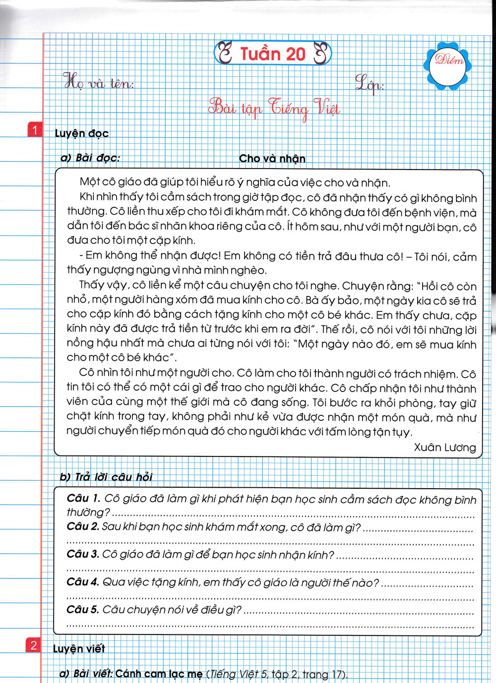 Phần tiếng Việt, các bạn nhỏ sẽ luyện tập phần đọc hiểu văn bản, tóm tắt và trả lời câu hỏi. Ngoài ra, còn có phần luyện tập cách lập dàn ý cho bài Tập làm văn hay như điền khuyết để rèn luyện chính tả