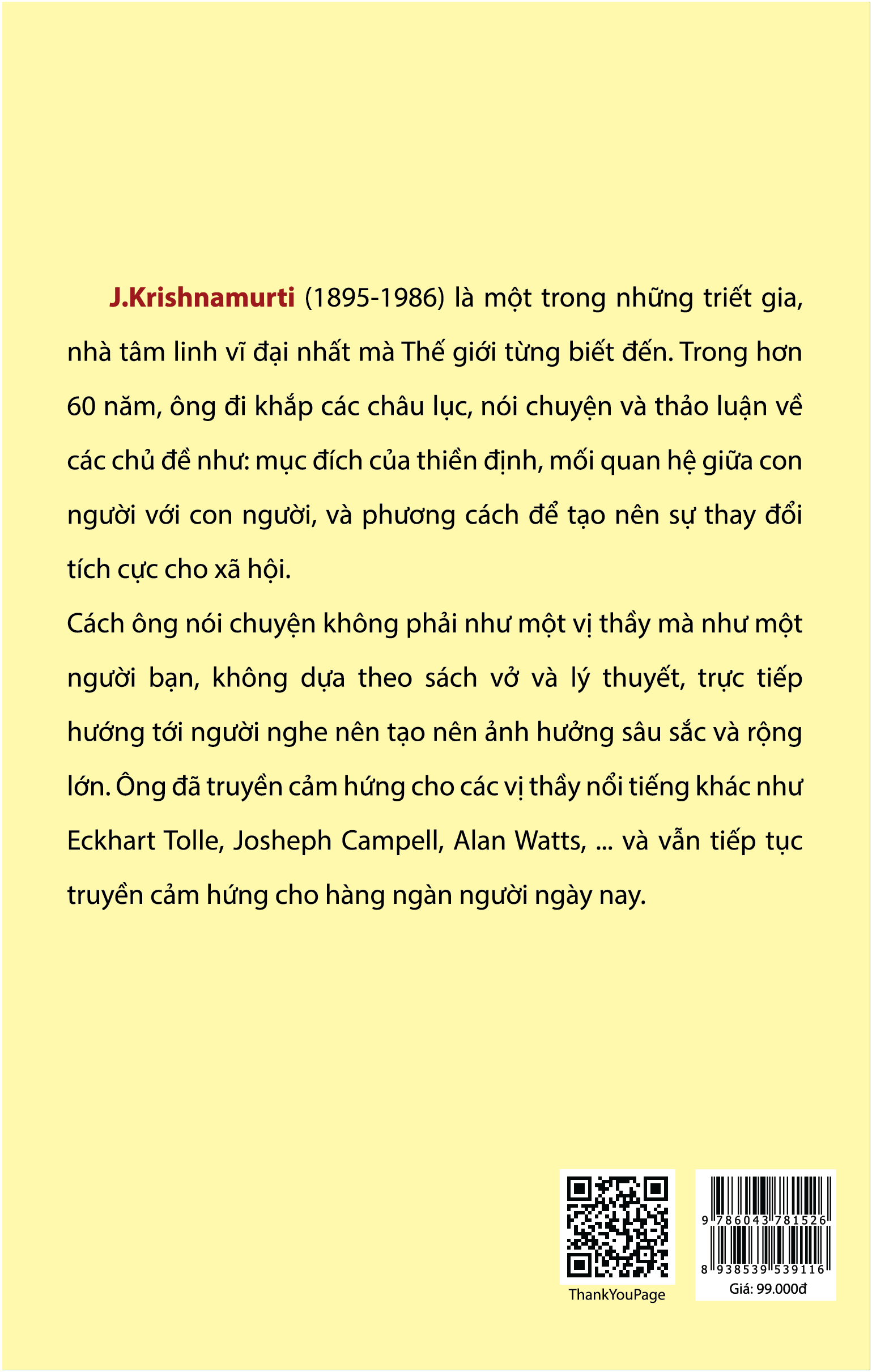 • Khổ sách: 13.5 x 20.5 cm KRISHNAMURTI NÓI VỀ TÌNH YÊU Tình yêu là một trong những điều quan trọng nhất trong đời sống. Vậy cớ sao con người lại trầm luân đau khổ vì tình yêu? Biết khổ mà không tài nào thoát ra khỏi khổ? Liệu có phải bởi chúng ta không thực sự hiểu về tình yêu? vì sâu thẳm trong chúng ta luôn cảm thấy cô đơn và khao khát được quan tâm, yêu và được yêu? Với ấn phẩm J. Krishnamurti Nói Về Tình Yêu, bạn sẽ biết được rất nhiều điều sâu sắc về tình yêu, rằng tình yêu không chỉ là sự kết nối tương giao về mặt thể chất, vật lý, tình dụ mà còn là sự kết nối, hợp nhất về tâm thức, về cảm xúc, về nội tâm… đến mức không có một sự chia cách nào; rằng tình yêu không chỉ là sự chiếm hữu, đau sầu, lo lắng mà tình yêu chính là tự do, yêu thương và hân hoan hạnh phúc; rằng tình yêu không phải là vô vàn các kĩ thuật tâm lý níu giữ người thương mà tình yêu là sự giản dị tự nhiên, chân thật và thuần khiết… Cuốn sách được viết với ba phần chính: Phần 1 là “Đời sống, tình yêu và cái chết”, phần 2 là “Con đường tình yêu” và phần 3 là “Tình yêu là thực tại”, sẽ dẫn dắt người đọc vào các cung bậc và khía cạnh của tình yêu. Xuyên suốt cuốn sách là tình yêu sâu sắc, trí tuệ, sáng trong của J. Krishnamurti với tha nhân. Với ngôn ngữ dịch gần gũi và tình yêu với cuộc sống, soạn giả Từ Hóa Hoàng Lan đã mang lại một ấn phẩm đẹp và cần thiết cho tất cả chúng ta. Ở đâu có tình yêu, ở đó có lòng bi mẫn, và lòng bi mẫn có trí thông minh của nó…