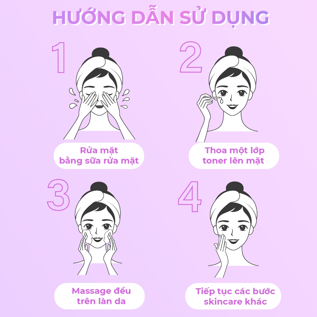 - Se khít lỗ chân lông Thành phần: Panthenol hay Vitamin B5, Niacinnamide, Allantoin, Adenosine, Sodium Hyaluronate, Glycyrrhiza glabra (licorice) root extract, Portulaca oleracea extract, Centella asiatica extract, Camellia sinensis leaf extract, Snail secretion filtrate. Hướng dẫn sử dụng: Bước 1: Tẩy trang và làm sạch da với sữa rửa mặt và lau khô Bước 2: Sau đó lấy một lượng toner vừa đủ cho vào lòng bàn tay, xoa 2 bàn tay vào nhau để làm nóng toner Thoa đều lên các vùng da trện mặt, massage nhẹ nhàng cho đến khi dưỡng chất thẩm thấu vào da Bước 3: Tiếp tục các bước skincare khác. LƯU Ý: