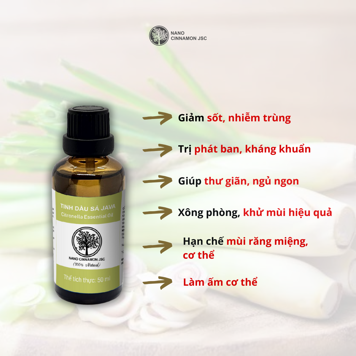 THÔNG TIN SẢN PHẨM: -Thể tích: 10ml, 50ml, 100ml, 500ml, 01 lít - Thành phần: Tinh dầu Sả Java nguyên chất - Đặc tính: Tinh dầu sả Java được sản xuất và kiểm định chặt