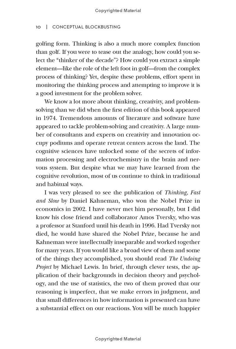 More than three decades after its original publication, Conceptual Blockbusting has never been more relevant, powerful, or fresh. Integrating insights from the worlds of psychology, engineering, management, art, and philosophy, Adams identifies the key blocks (perceptual, emotional, cultural, environmental, intellectual, and expressive) that prevent us from realizing the full potential of our fertile minds. Employing unconventional exercises and other interactive elements, Adams shows individuals, teams, and organizations how to overcome these blocks, embrace alternative ways of thinking about complex problems, and celebrate the joy of creativity. Completely revised and updated with the latest cognitive science and addressing new subjects such as changes in technology, creativity in large groups, and sustaining creativity over time, Conceptual Blockbusting will introduce a new generation of readers to a world of new possibilities.