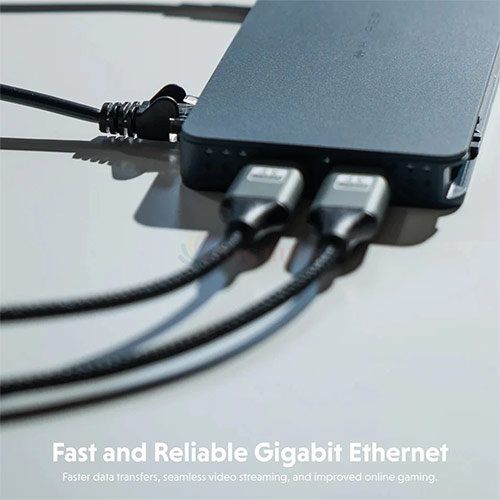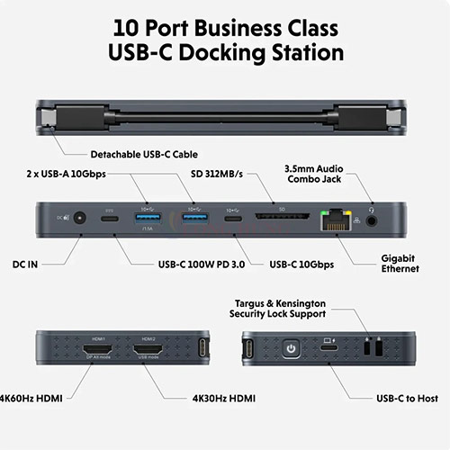 - Hỗ trợ kết nối với hai màn hình 4K cho tất cả các thiết bị Mac, PC và Chromebook, sở hữu 10 cổng siêu tốc